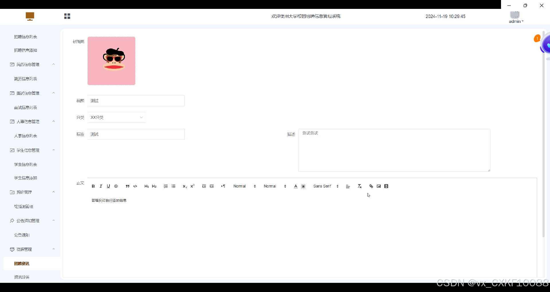 - 招聘资讯管理:发布行业招聘动态、就业政策解读及校企合作资讯,为学生和企业提供参考信息。