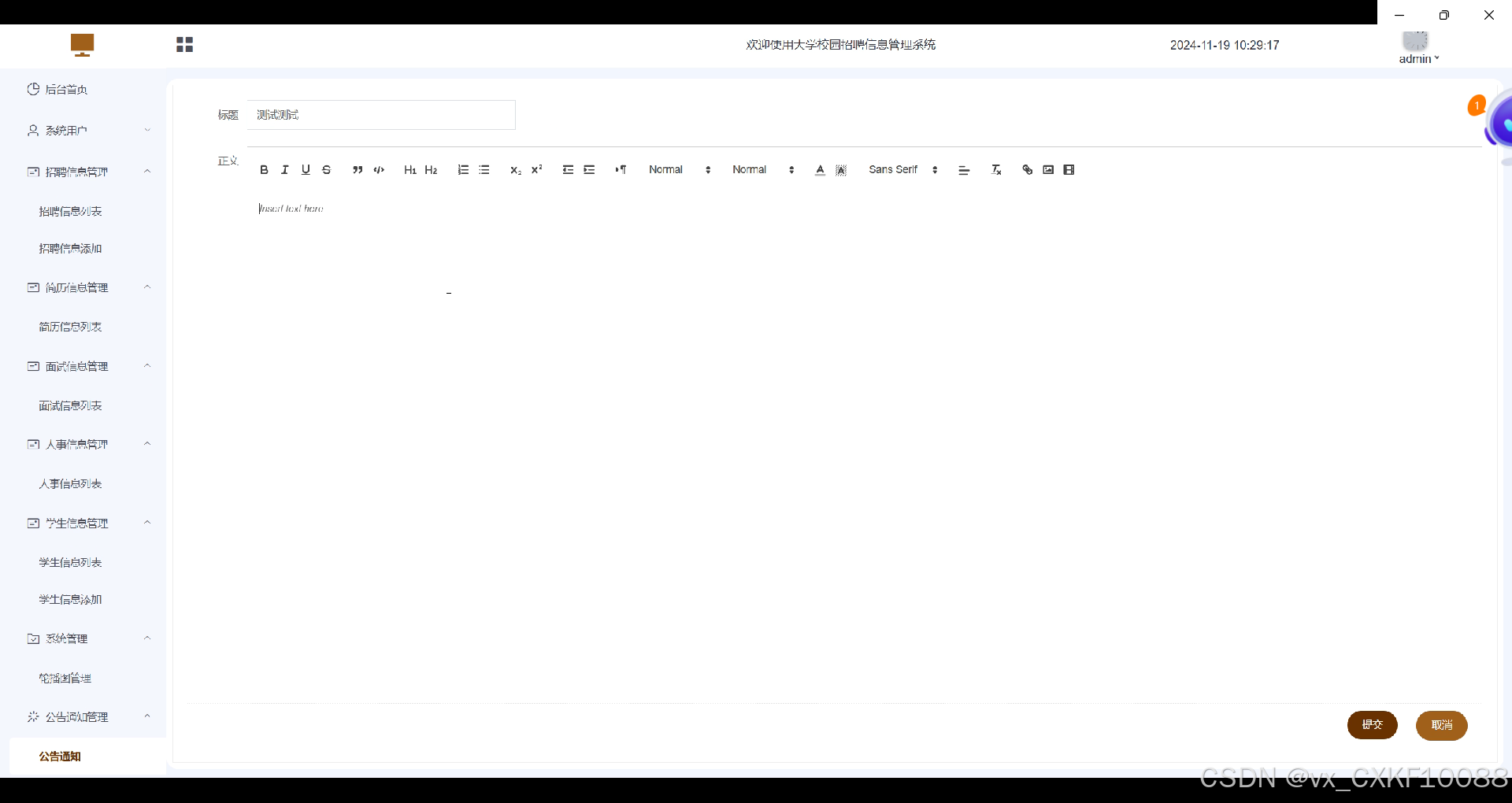 公告通知管理模块是管理员发布和维护平台重要信息的核心功能。系统支持管理员创建、编辑、发布和删除公告通知,可设定标题、内容、发布时间及目标用户群(如学生、企业或教师)。管理员能有效传达平台政策、活动信息及紧急通知,提升用户沟通效率。如下图所示。