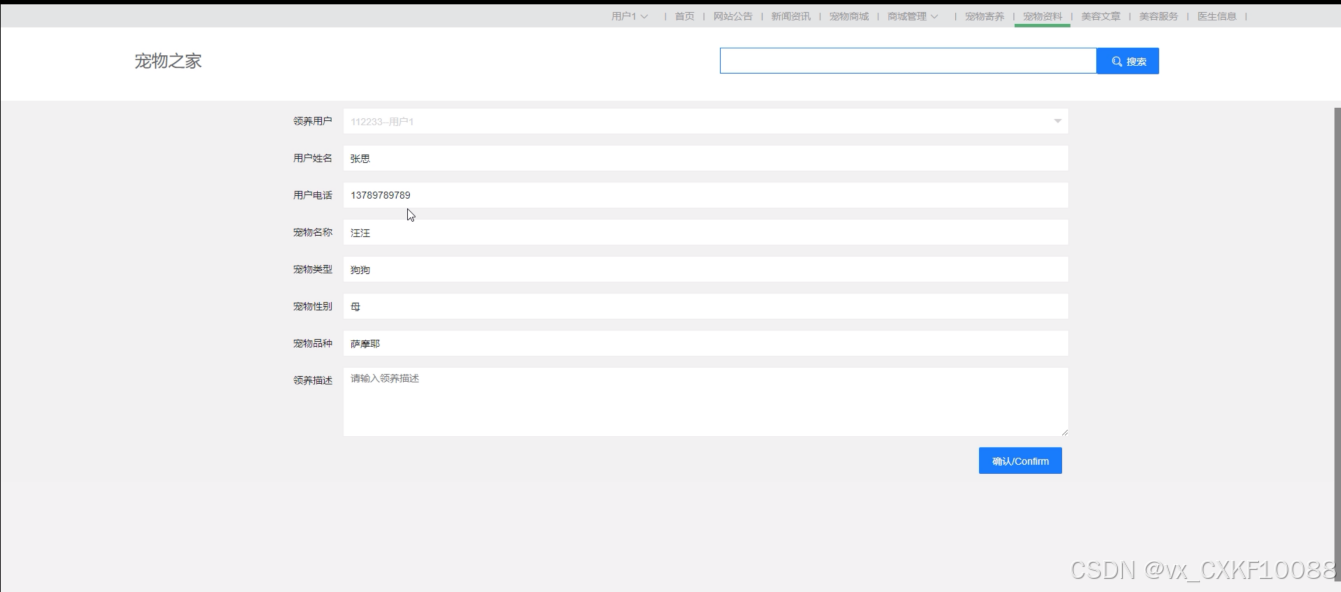 (8)宠物资料:用户点击进入可通过搜索宠物名称、宠物类型进行查看宠物资料,可对感兴趣的宠物进行点赞、收藏、评论;同时可点击“申请领养”按钮,填写领养信息,包括领养用户、用户姓名、用户电话、宠物名称、宠物类型、宠物性别、宠物品质和领养描述。
