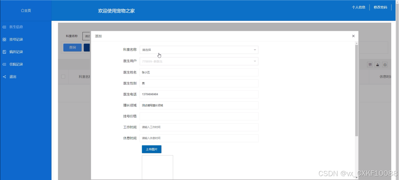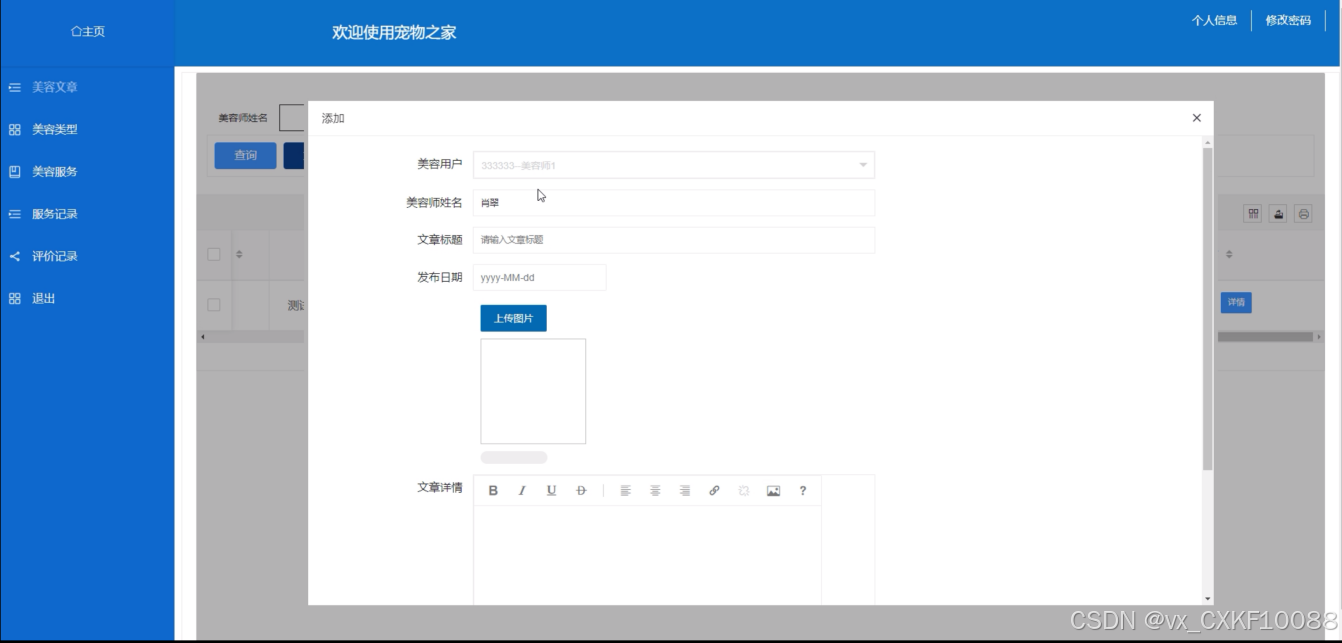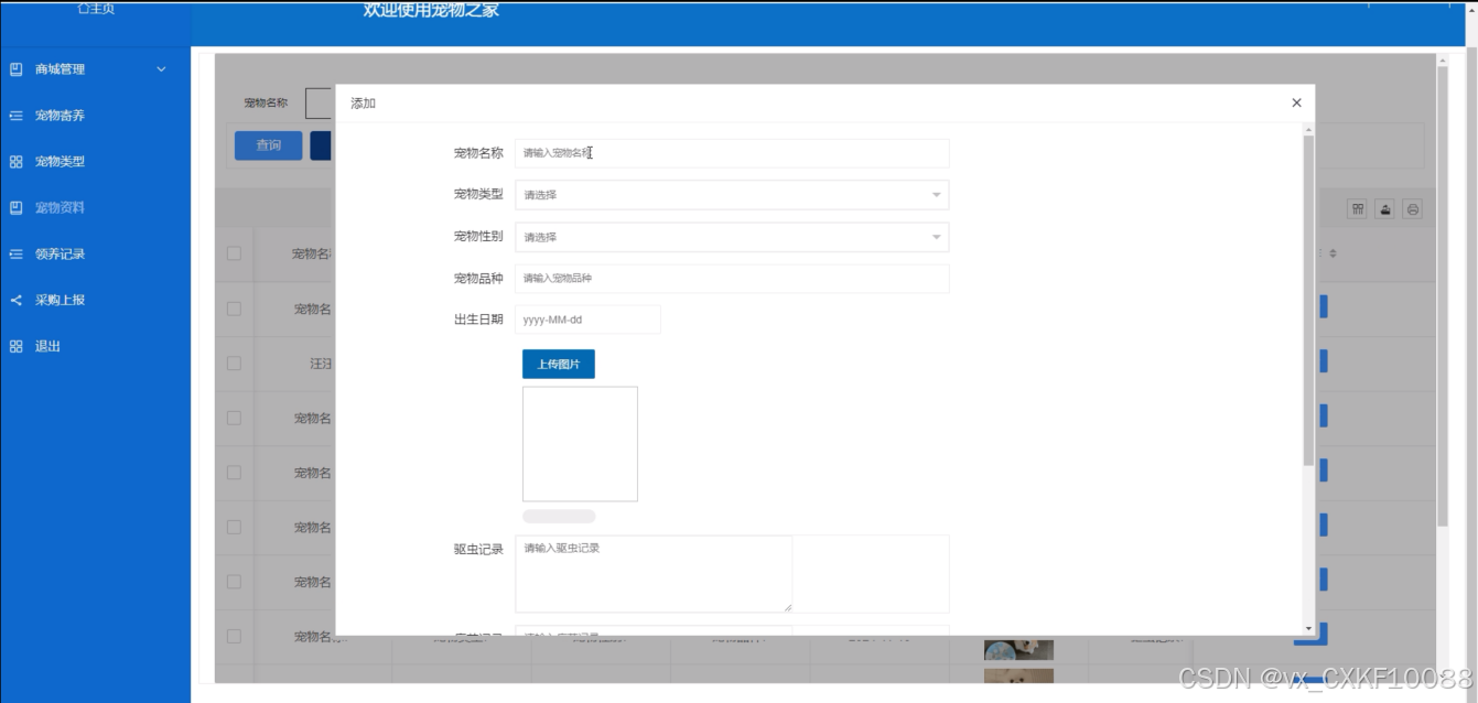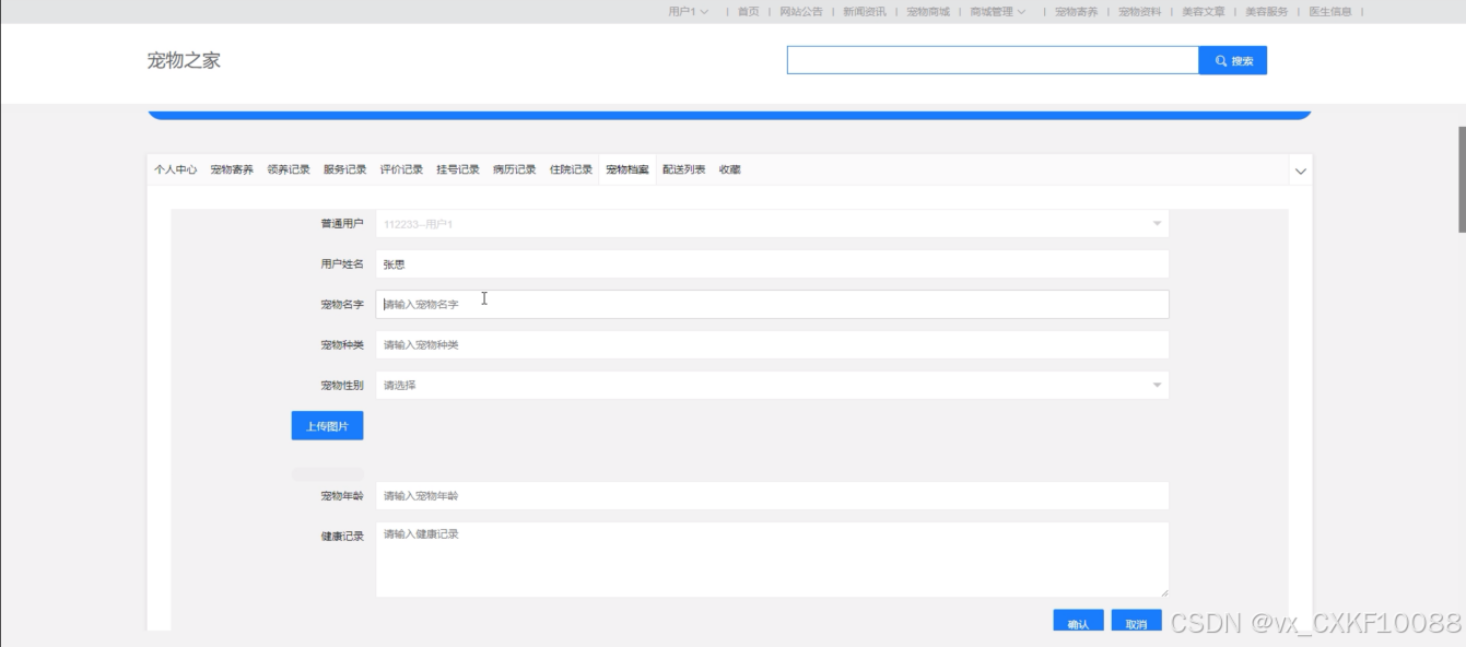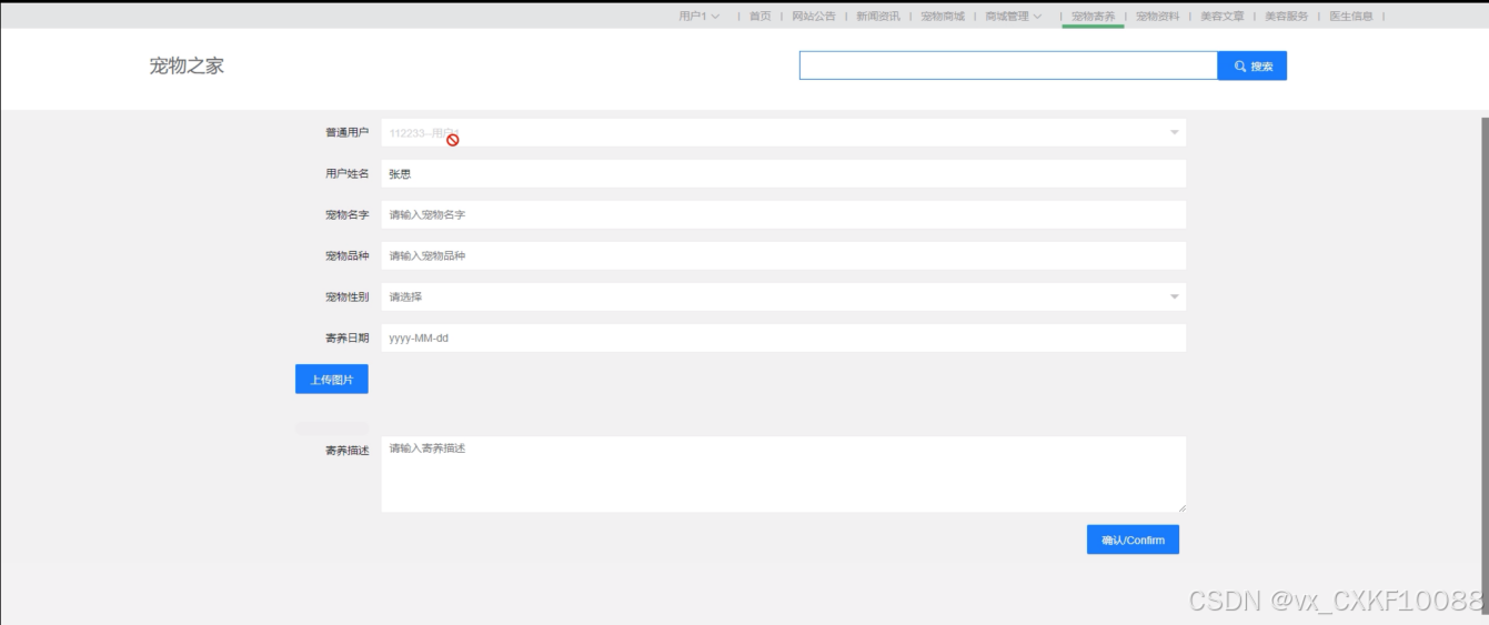 (7)宠物寄养:用户点击可填写宠物寄养信息,包括宠物名字、宠物品种、宠物性别、寄养日期、图片和寄养描述。(普通用户、用户姓名)