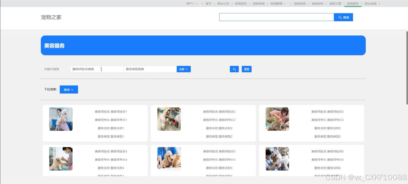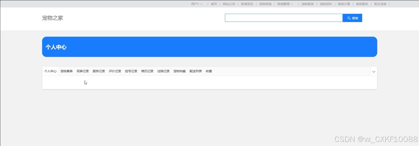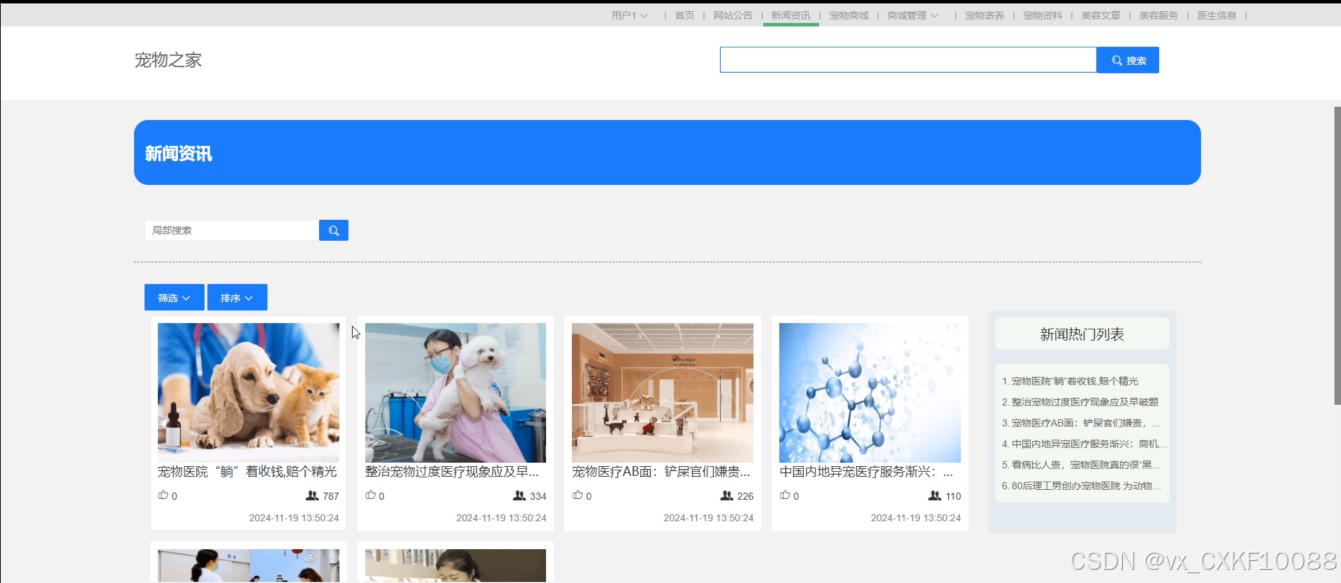 (2)首页:用户登录系统后首先进入首页界面,可查看网站公告、新闻资讯、宠物商城、商城管理、宠物寄养、宠物资料、美容文章、美容服务和医生信息等功能导航栏。