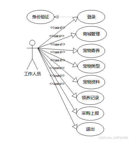 1. 需求分析:系统的需求分析主要基于宠物之家管理的实际需求,涵盖了普通用户、工作人员、美容用户、医生用户和管理员五大角色的功能需求。系统还需要具备数据统计与分析功能,支持各类用户角色之间的信息流转和权限管理。
