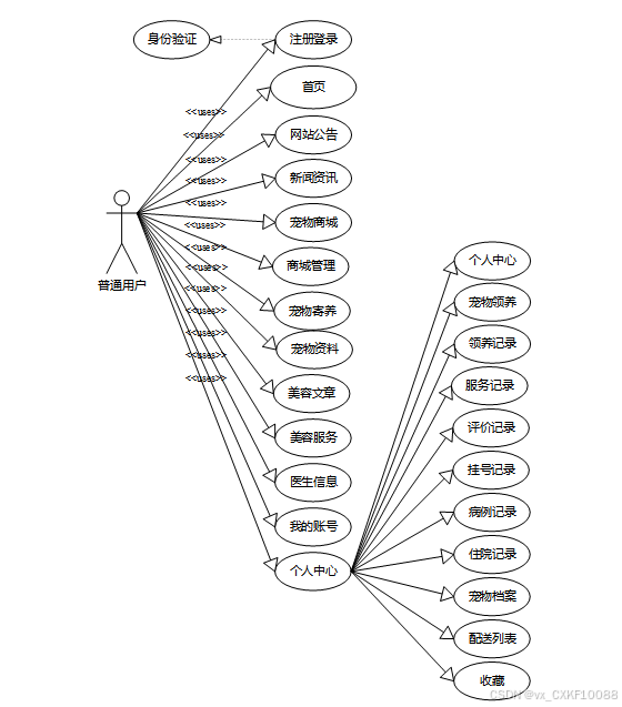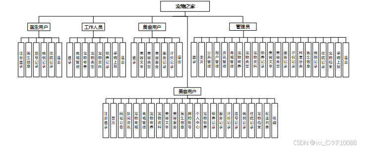 宠物之家包含普通用户、医生用户、工作人员、美容用户和管理员五类用户功能。
