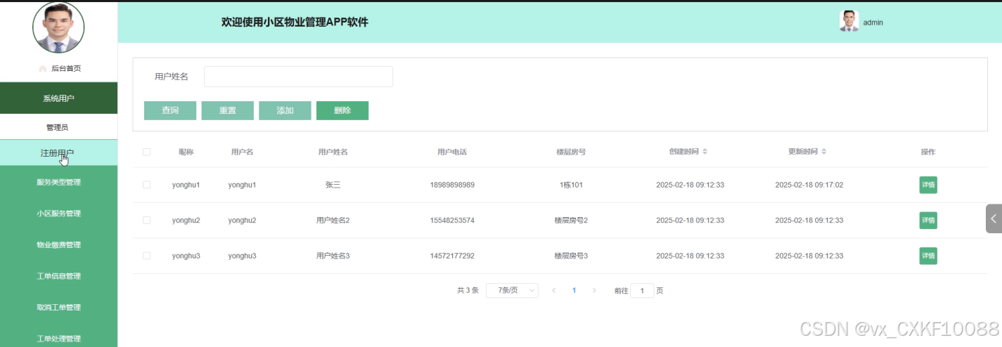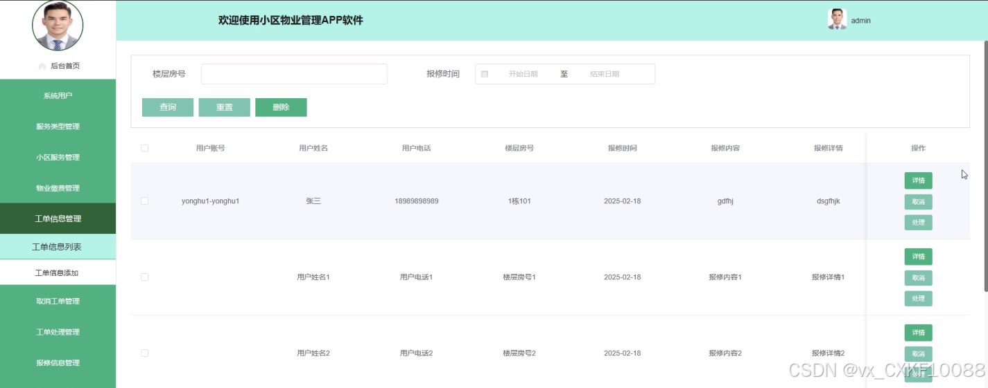 The administrator function covers comprehensive management of system users, including adding, deleting, modifying, and querying all user information (administrators, registered users). Administrators are also responsible for managing and maintaining various aspects such as service types, community services, property payments, work order information, work order cancellation, work order processing, repair information, repair processing, system carousel, community feedback, notification announcements, property information and its classification, user permissions, etc. These functions ensure the normal operation of the system and provide a solid foundation for improving property management efficiency and service quality.