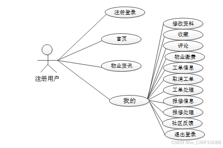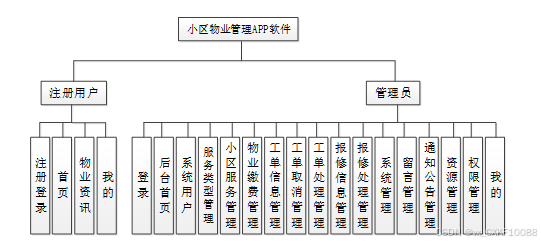 按照小区物业管理APP软件的角色,主要包括注册用户和管理员这两大用户功能模块,各用户功能模块的具体功能说明如下。
