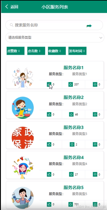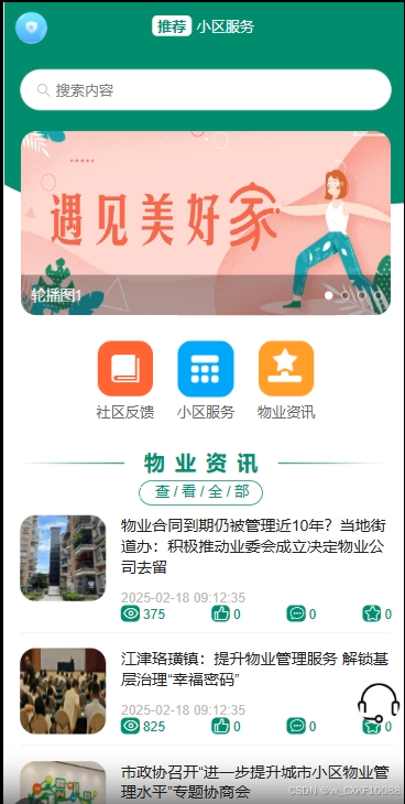 - 首页:用户通过APP首页可以查看系统轮播图、社区反馈、小区服务、物业资讯、通知公告等信息并进行相关操作
