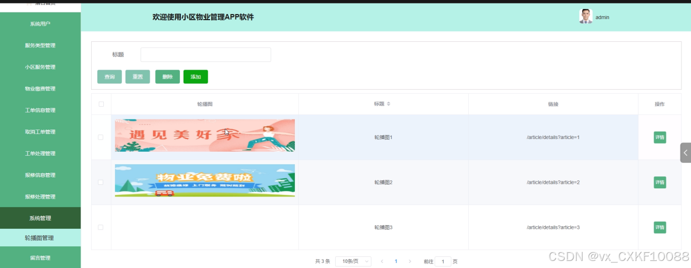 - 系统管理:在系统管理界面管理员对系统轮播图进行增删改查操作。