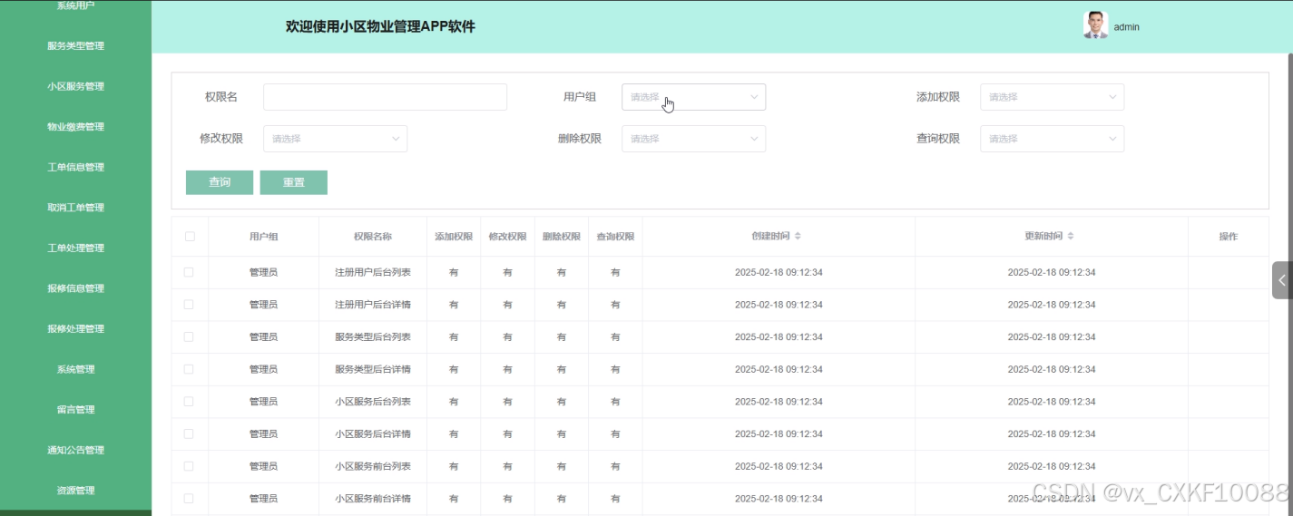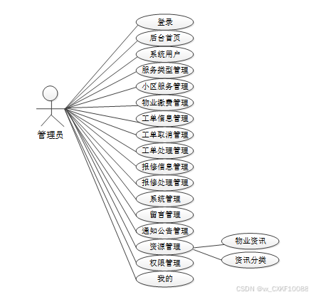 管理员功能则涵盖了对系统用户的全面管理,包括增删改查所有用户信息(管理员、注册用户)。管理员还负责服务类型、小区服务、物业缴费、工单信息、工单取消、工单处理、报修信息、报修处理、系统轮播图、社区反馈、通知公告、物业资讯及其分类、用户权限等多方面的管理与维护工作。这些功能确保了系统的正常运行,同时也为提升物业管理效率和服务质量提供了坚实的基础。