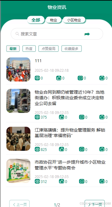 - 物业资讯:用户点击APP首页正下方的“物业资讯”进入页面可以查看资讯列表中某个资讯的详情并可以进行点赞、收藏和评论操作。