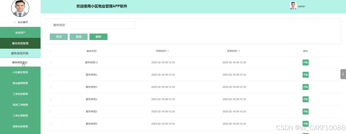 - 服务类型管理:管理员可以添加服务类型信息,可以对已有的服务类型信息进行查询、重置和删除操作。