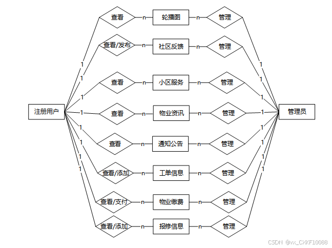该系统主要分为注册用户功能和管理员功能两大部分。对于普通用户而言,可以通过注册成为系统用户,并使用账号密码登录系统。首页展示了丰富的社区信息,包括轮播图、社区反馈、小区服务、物业资讯、通知公告等,用户可以在此基础上进行相关操作。此外,用户还能查看并互动于物业资讯,执行点赞、收藏、评论等动作;在我的页面中,用户能够修改个人资料、查看个人信息、处理缴费、工单、报修事宜以及提交或查看社区反馈。