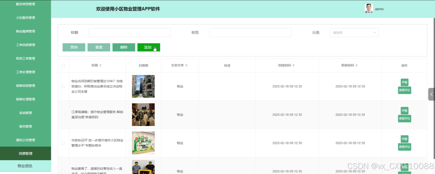 - 资源管理:在资源管理模块管理员对物业资讯和资讯分类进行管控,可以对物业资讯和资讯分类信息进行增删改查操作。