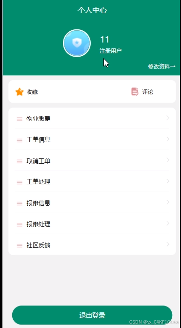 - 我的:用户点击首页正下方的“我的”进入页面可以修改资料和查看修改资料、评论、物业缴费、工单信息、取消工单、工单处理、报修信息、报修处理和社区反馈信息并进行相关操作。点击“修改资料”进入页面可以修改个人资料和登录密码。
