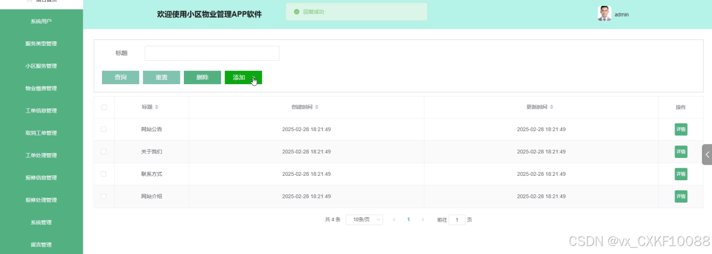 - 小区服务管理:管理员可以添加小区服务信息,可以对已有的小区服务信息进行查询、重置和删除操作。