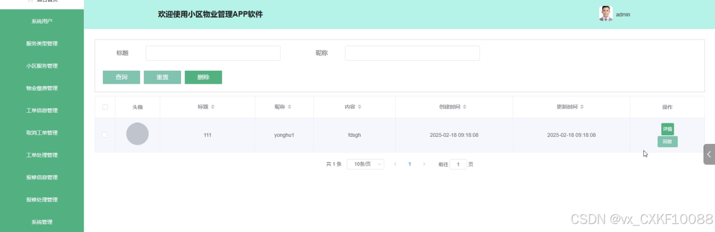 - 留言管理:管理员可以查看社区反馈列表中某个用户提交的反馈信息详情,点击“回复”可以对用户反馈进行相关回复。
