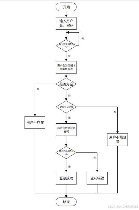 用户输入用户名和密码后,系统先检查输入是否为空,再验证用户名是否存在,若存在则通过用户名获取密码并校验。若密码正确则登录成功,否则提示密码错误。若用户名不存在或无法登录,提示用户操作无效。如图4-1所示。