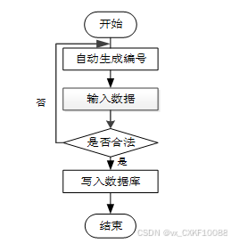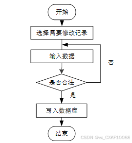 用户首先选择需要修改的记录,输入修改后的数据,系统判断输入数据是否合法。若数据不合法,提示重新输入;若数据合法,则将修改后的数据写入数据库,完成操作后流程结束。修改信息流程图如图4-3所示。