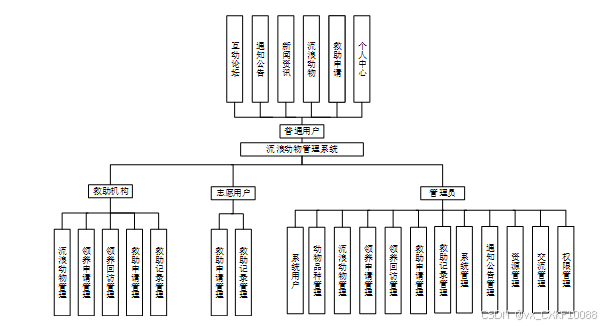 流浪动物管理系统的功能需求主要包括四个方面:信息管理、用户管理、申请管理和资源管理。系统需要提供一个信息管理模块,允许管理员和相关用户查看、更新流浪动物的基本信息,并支持动物品种、健康状况、位置等详细描述的存储与展示。对于申请管理,系统应支持用户提交领养申请或救助申请,并提供审批、反馈、回访等流程,确保动物能够得到有效的领养或救助。管理员需要能够处理这些申请,进行审核和记录管理。同时,系统还需具备互动论坛功能,允许用户进行讨论、评论和交流,增强用户之间的互动与沟通。在资源管理方面,系统应支持发布新闻资讯、公告以及更新平台内容等功能,以保持信息的时效性。此外,为提高流浪动物救助的协调性,救助机构和志愿者需要一个专门的管理模块,帮助他们追踪救助记录、资源分配及后续的回访工作。系统还应具有权限管理功能,确保不同角色的用户只能访问与其职责相关的功能,从而提升数据安全性和管理效率。系统功能结构图如图3-1所示。