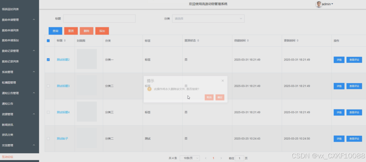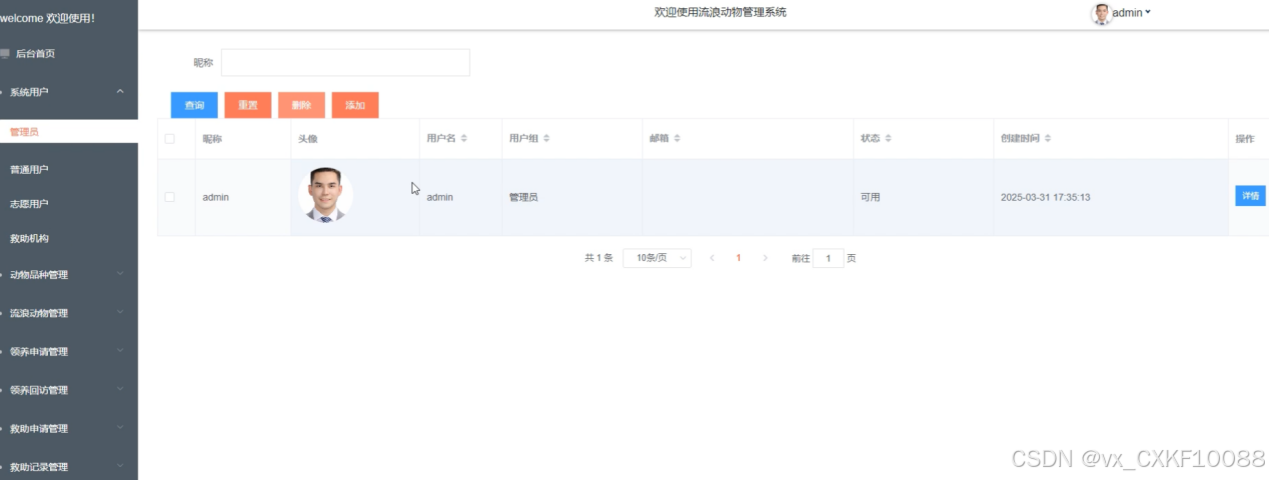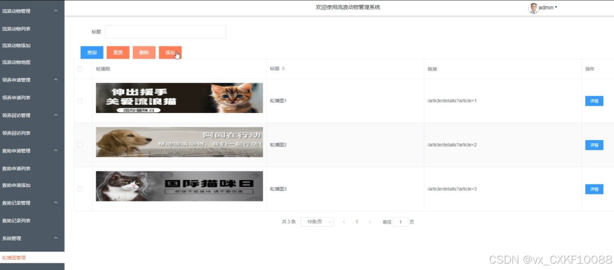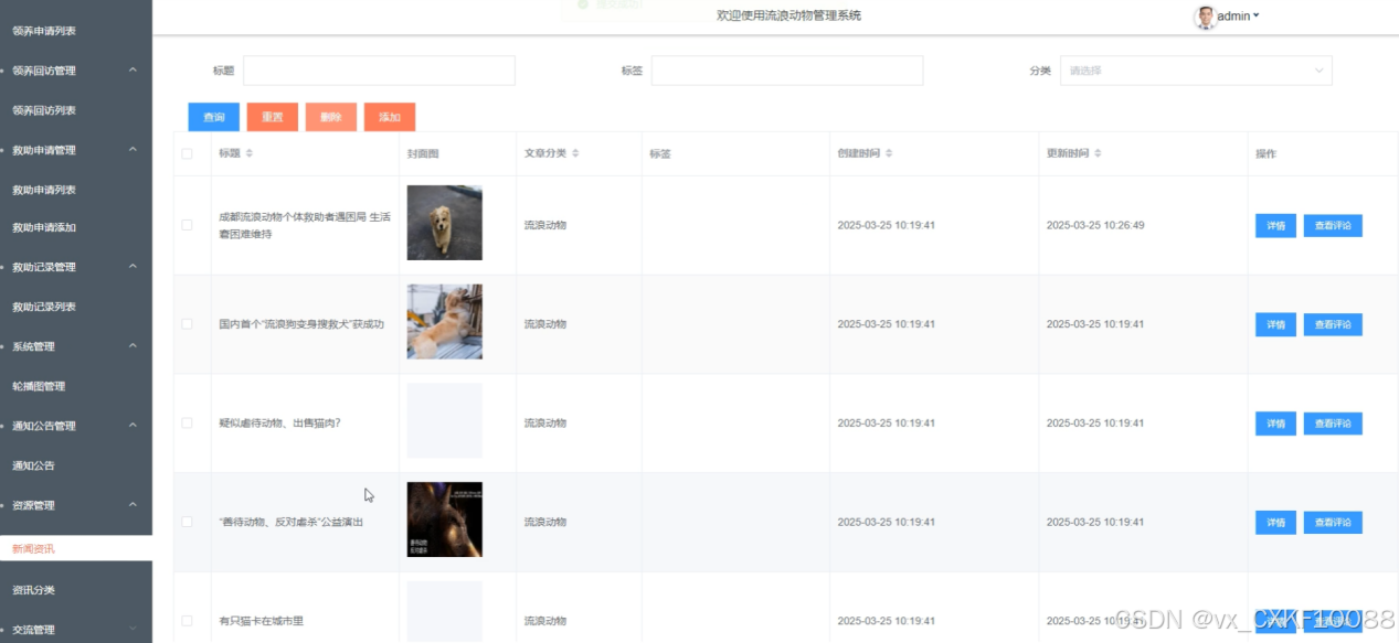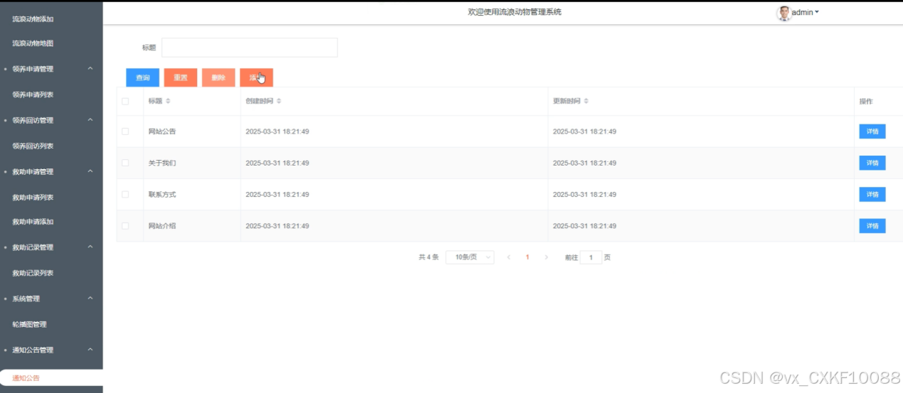 As urbanization accelerates, the problem of stray animals has become increasingly severe, emerging as a prominent social issue in urban management. Stray animals not only face survival difficulties but also pose negative impacts on public safety, environmental sanitation, and other areas. Therefore, how to effectively manage stray animals and promote adoption and rescue has become a pressing issue that needs to be addressed. The stray animal management system, developed using SpringBoot and MySQL technologies, aims to provide a one-stop solution for the rescue, adoption, and information management of stray animals. By dividing user roles and permissions, the system enhances management efficiency and participation. Ordinary users can browse information about stray animals on the platform, apply for adoption or rescue, and participate in interactive forums, which helps raise public awareness and involvement in stray animal issues. Administrators can centrally manage stray animals, adoption applications, rescue records, etc., and publish notifications, news, and other information, ensuring the timeliness and accuracy of platform content. Rescue organizations and volunteers can effectively coordinate resources and manage rescue records and applications, further optimizing the rescue process for stray animals. The implementation of this system not only improves the efficiency of stray animal rescue and alleviates the animals' plight but also encourages participation and attention from all sectors of society towards the protection of stray animals, contributing positively to the development of public welfare and the building of a harmonious society.