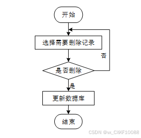 用户选择需要删除的记录后,系统判断是否确认删除。若未确认,返回选择环节;若确认删除,则更新数据库,删除对应记录,完成操作后流程结束。删除信息流程图如图4-4所示。