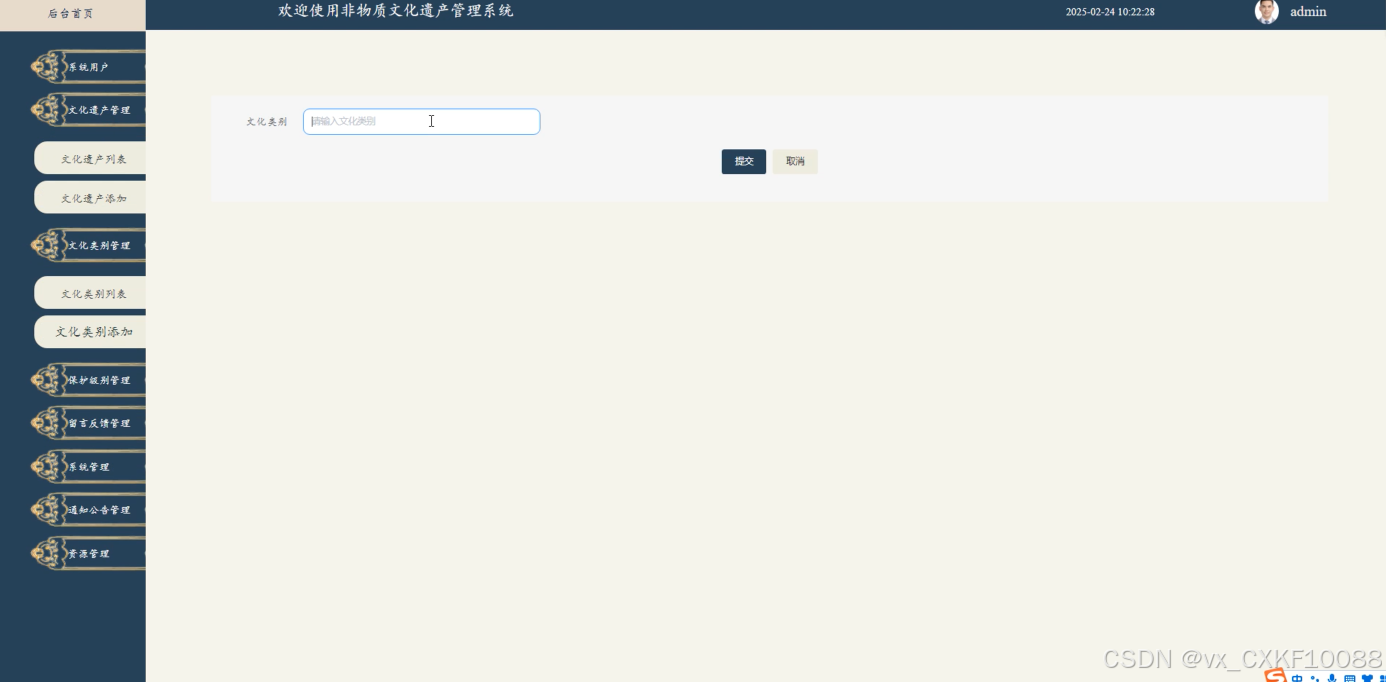 文化类别管理:维护非遗文化类别列表,支持新增、修改或删除类别名称。