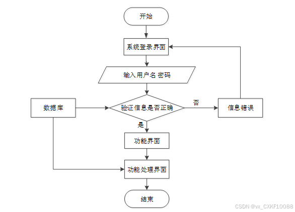 用户访问平台的网站,进入登录页面页面,输入其用户名和密码,后端服务接收登录请求,验证用户提供的用户名和密码是否匹配数据库中存储的信息,验证通过即可登录成功。登录流程图如下图所示。