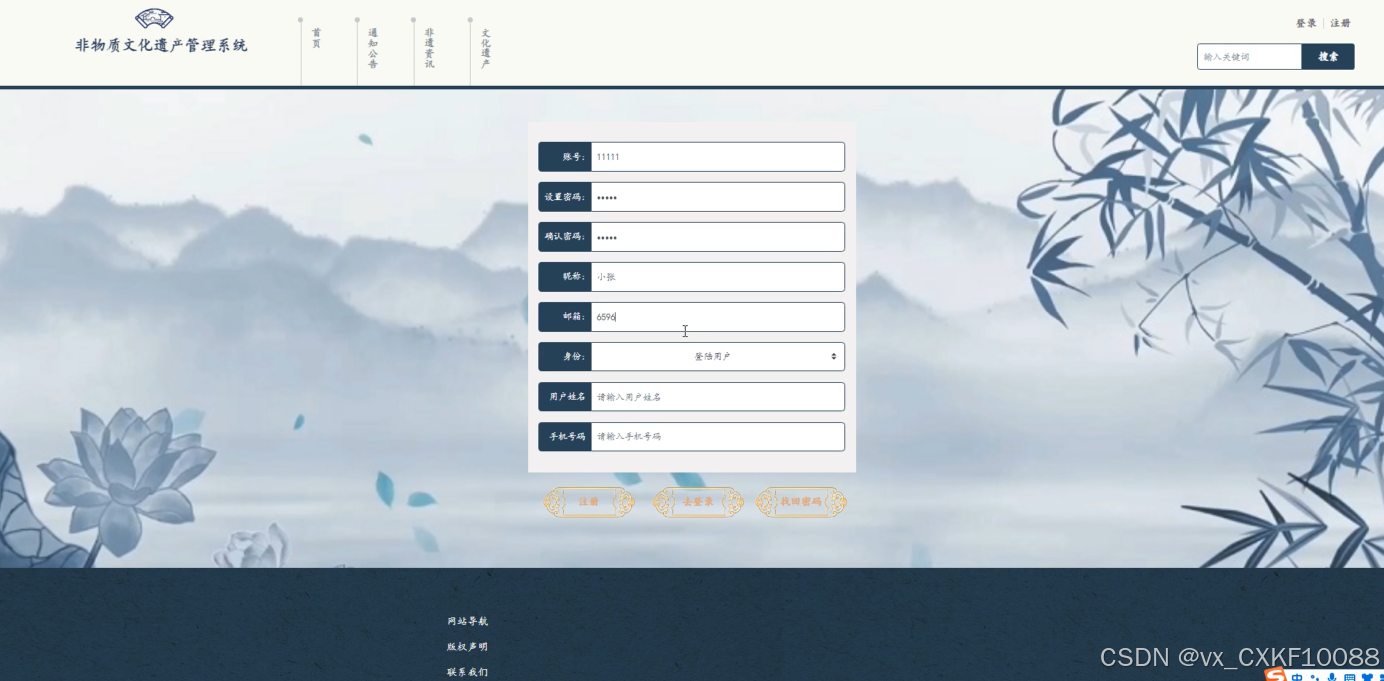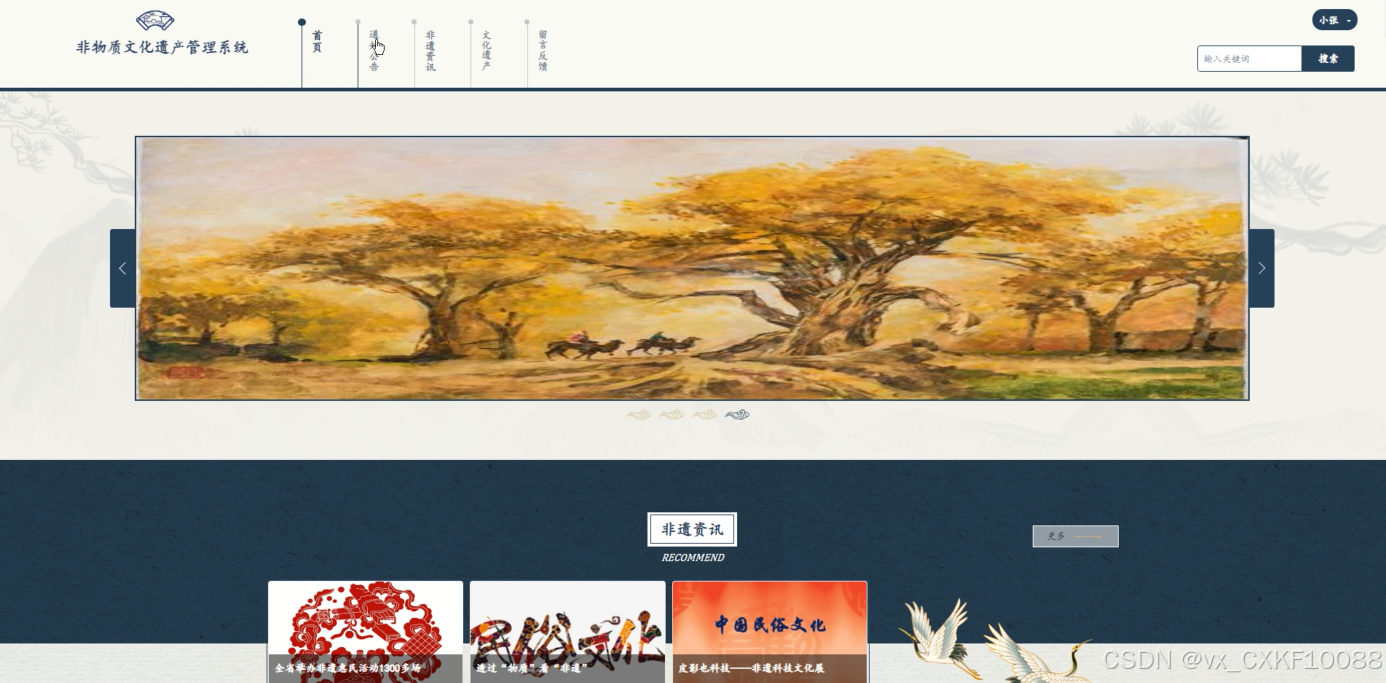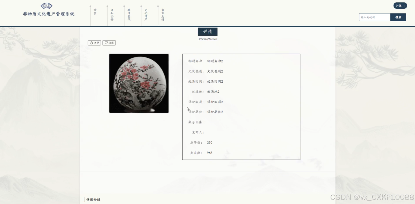 The development of this system not only improves the efficiency of intangible cultural heritage management, but also provides new ideas for the digital protection of intangible cultural heritage. It helps to expand the influence of intangible cultural heritage and promote the public's attention and participation in intangible cultural heritage. At the same time, the openness and scalability of the system have laid the foundation for the further improvement of intangible cultural heritage management in the future, and have important practical value and promotion significance.