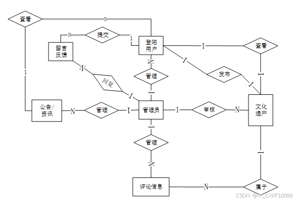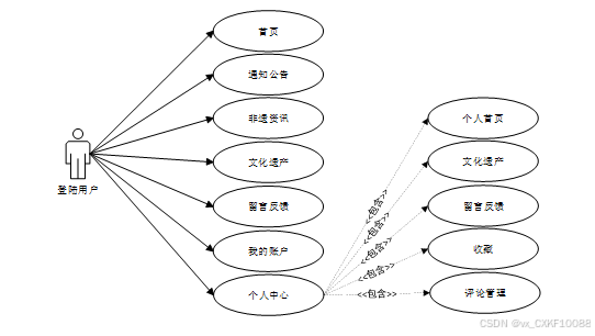 系统用例分析是对非物质文化遗产管理系统中各个功能模块的用户需求和行为进行分析,以识别和描述不同的用户用例。通过系统用例分析,可以深入了解用户在系统上的操作流程和交互方式,为系统设计和开发提供指导,并确保系统能够满足用户的需求和期望。