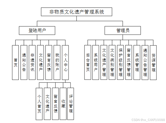 本系统旨在满足登陆用户和管理员两大角色的功能需求,提供全面的非物质文化遗产管理服务。对于普通用户,系统支持非遗资讯浏览、文化遗产查看、留言反馈及个人中心管理等功能;而对于管理员,则提供后台数据管理能力,包括用户管理、文化遗产审核与发布、文化类别维护、保护级别设定以及系统配置等,确保系统高效运行并实现非遗文化的规范化管理。具体功能描述如下: