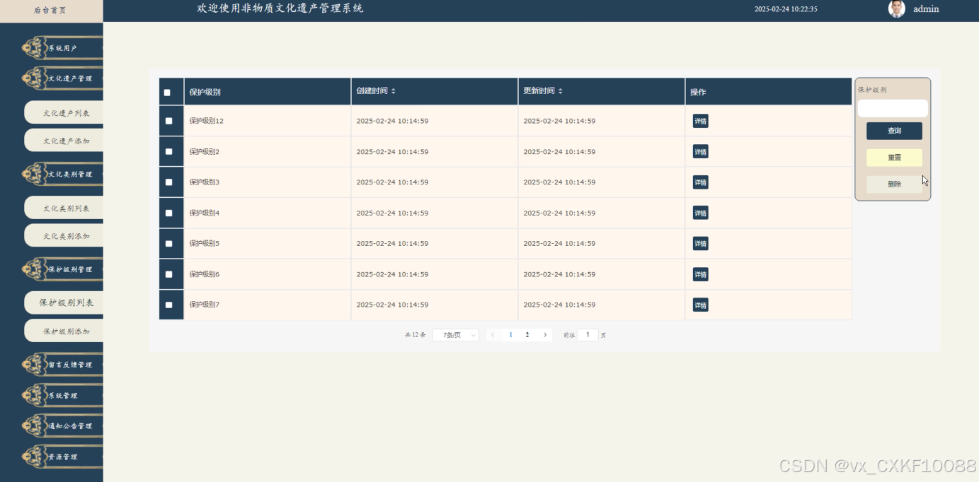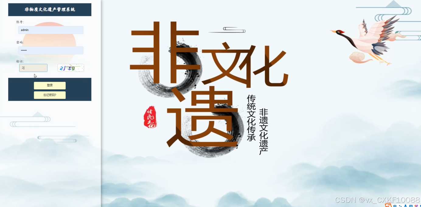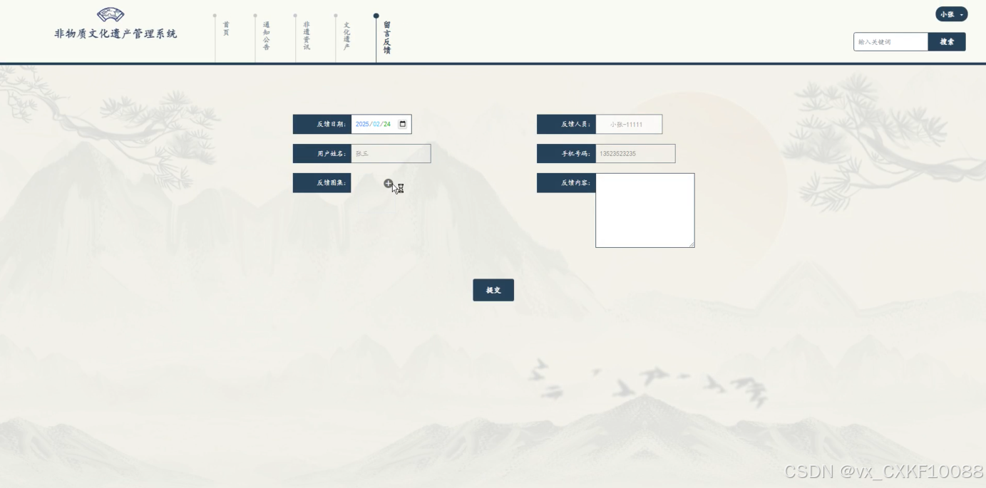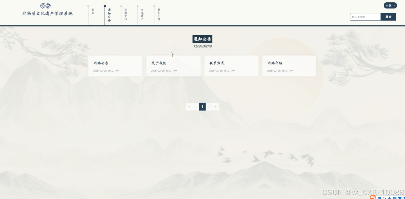 The system uses the Spring Boot framework for back-end development, combines the Java language to realize business logic processing, and uses the MySQL database to complete data storage and management. The system mainly implements functional modules such as user management, cultural heritage management, message feedback, and information management, and introduces Redis caching technology to optimize performance and user experience. In addition, the security and stability of the system are ensured through role permission control.