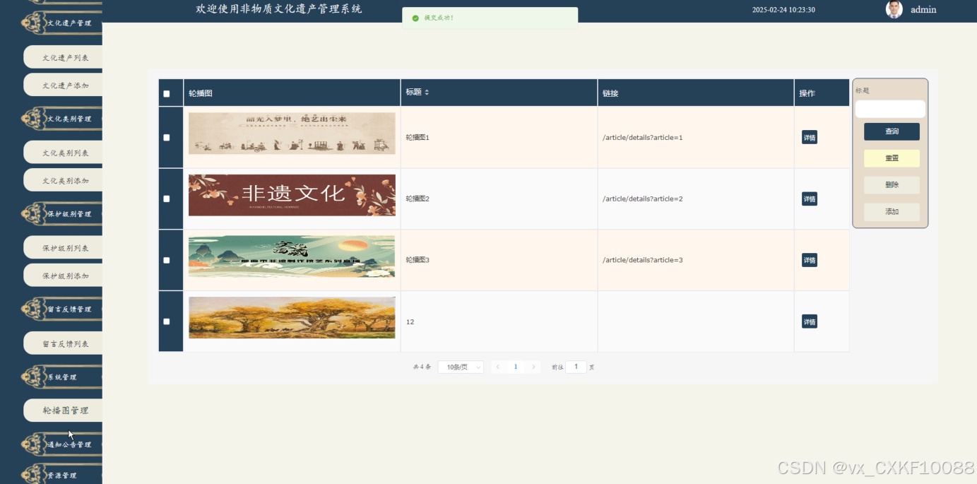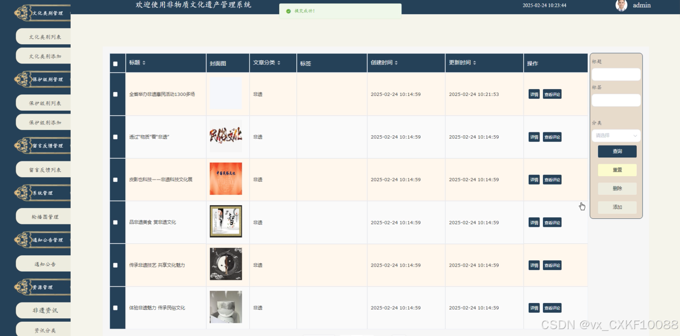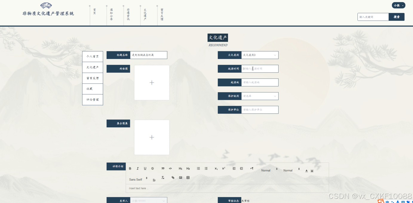 资源管理:添加、编辑和删除非遗资讯内容,保持资讯更新。维护非遗资讯的分类体系,优化用户检索体验。