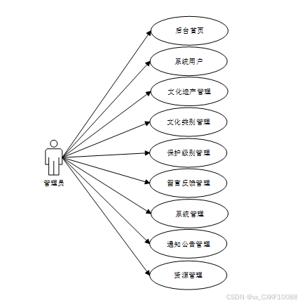 管理员负责系统的整体运营与维护,其核心职责是确保平台内容的准确性和管理的高效性。管理员需要对用户提交的文化遗产信息进行审核与发布,同时维护文化类别、保护级别等基础数据。此外,管理员还需管理用户账号、处理留言反馈、发布通知公告,并对轮播图、非遗资讯等内容进行更新与调整。通过全面的后台管理功能,管理员能够有效保障系统的正常运行及非遗文化的规范化管理。管理员角色用例图如图3-2所示。