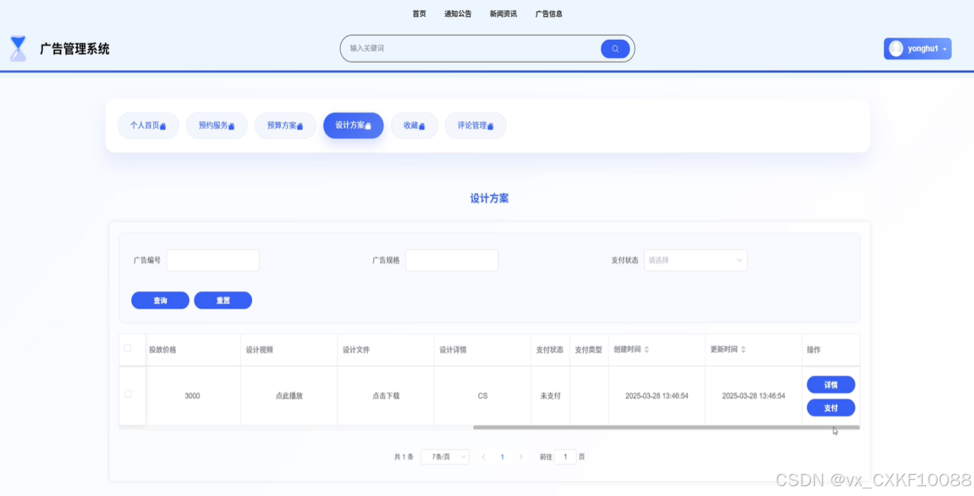 (9)设计方案管理:商家用户需做出广告设计方案给客户参考查看。可进行查询、重置、删除等操作。