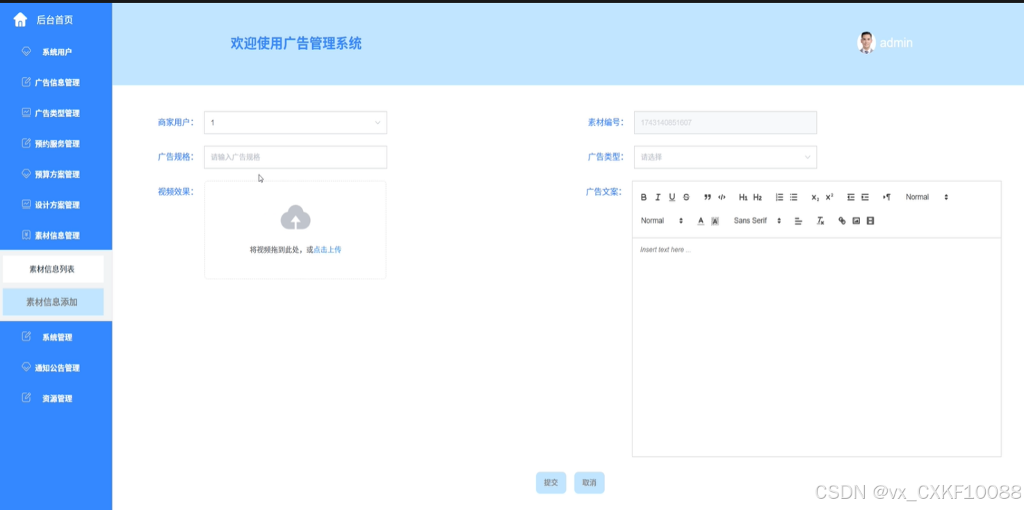 (7)素材信息管理:包含素材信息列表和素材信息添加功能。素材信息列表:主要管理素材信息,支持查询、修改、删除等操作。可查看具体素材信息记录详情。素材信息添加:主要添加的素材信息数据。