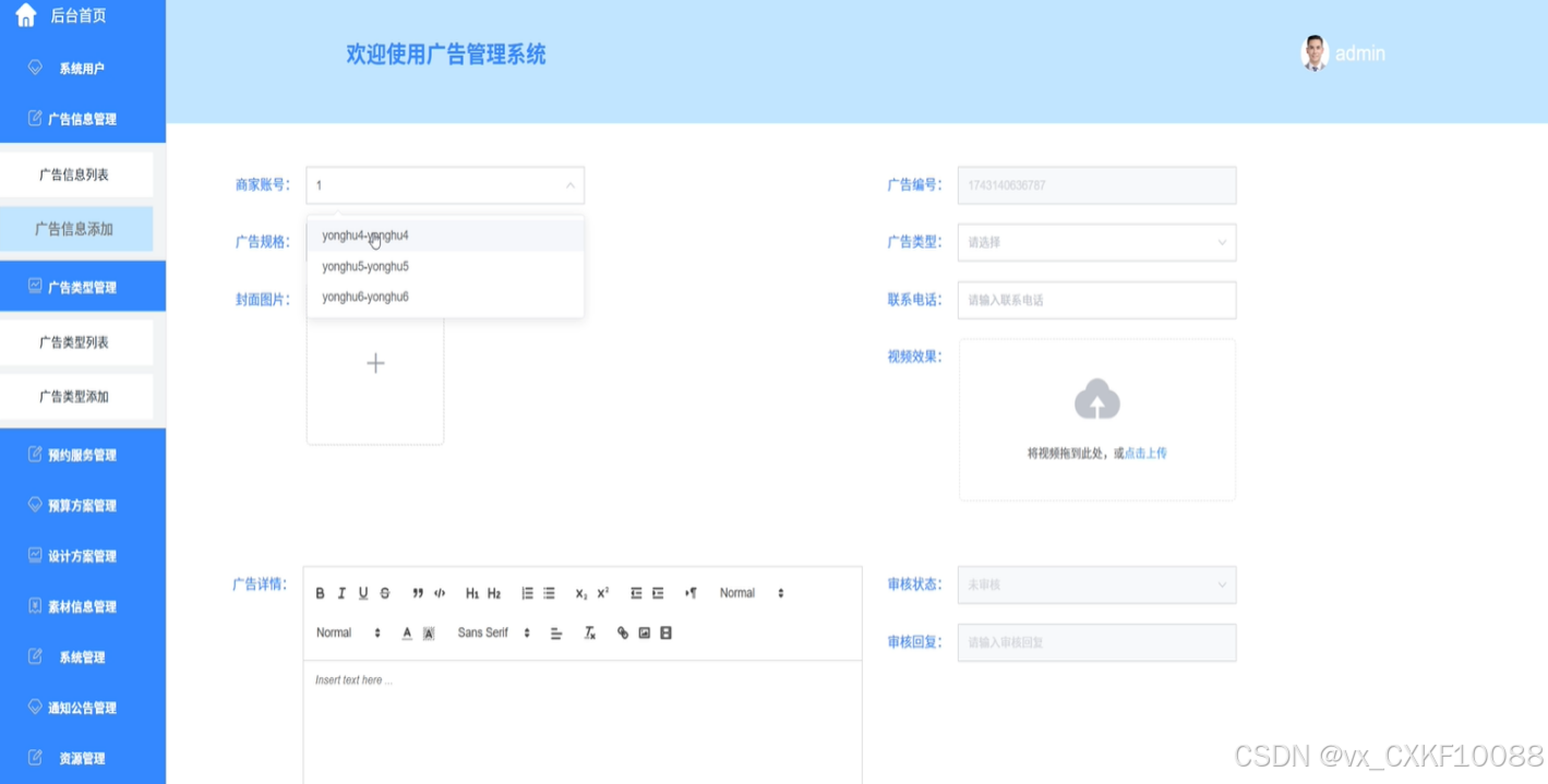 (3)广告信息管理:包含广告信息列表和广告信息添加功能。广告信息列表:主要管理所有商家广告信息,支持查询、修改、删除等操作。可查看具体广告信息记录详情。广告信息添加:主要添加的广告信息数据。添加的信息可在前台展示。