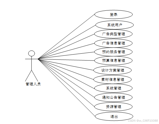 基于SpringBoot+Vue的广告管理系统的设计与实现中管理员涉及后台首页、系统用户、广告分类管理、广告信息管理、预约服务管理、预算信息管理、设计方案管理、素材信息管理、系统管理、通知公告管理、资源管理等,管理员对应的用例图如图3.3所示: