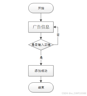 添加广告信息,输入广告名称、广告规格、广告类型、广告编号等信息,并校验输入是否正确,广告信息添加流程图,如图所示: