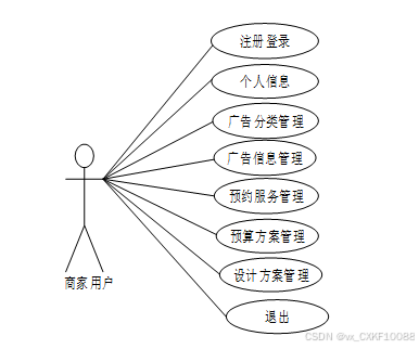 基于SpringBoot+Vue的广告管理系统中商家用户包含注册登录、个人信息、广告分类管理、广告信息管理、预约服务管理、预算方案管理、设计方案管理等功能模块,对应角色用例图如图3.2所示: