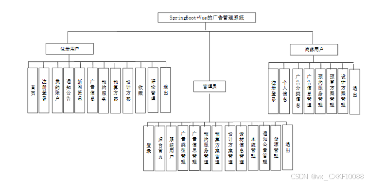 基于SpringBoot+Vue的广告管理系统包含注册用户、商家用户和管理员三个角色划分,每个角色对应的主要功能如下: