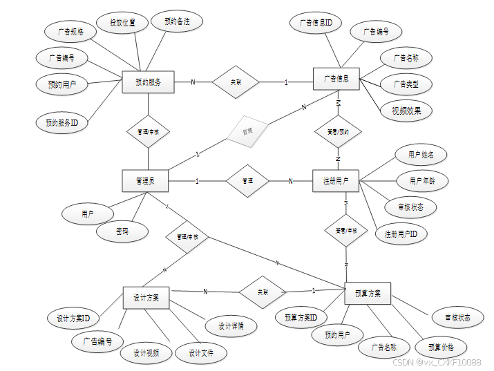 基于SpringBoot+Vue的广告管理系统的管理员、注册用户、广告信息、预约服务、预算方案、设计方案等E-R实体关系图。