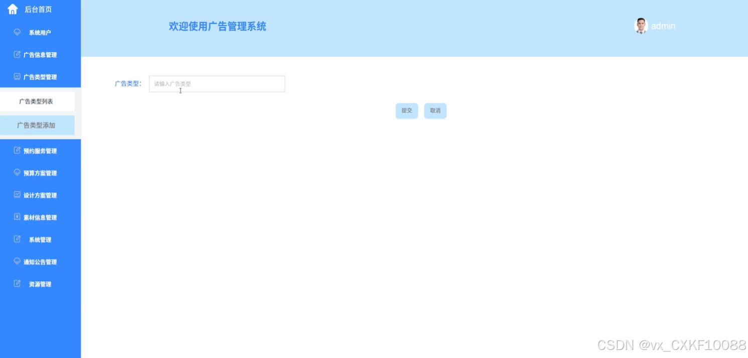 (2)广告类型管理:包含广告类型列表和广告类型添加功能。广告类型列表:主要管理所有广告类型信息,支持查询、修改、删除等操作。可查看具体广告类型记录详情。广告类型添加:可手动添加广告类型数据。
