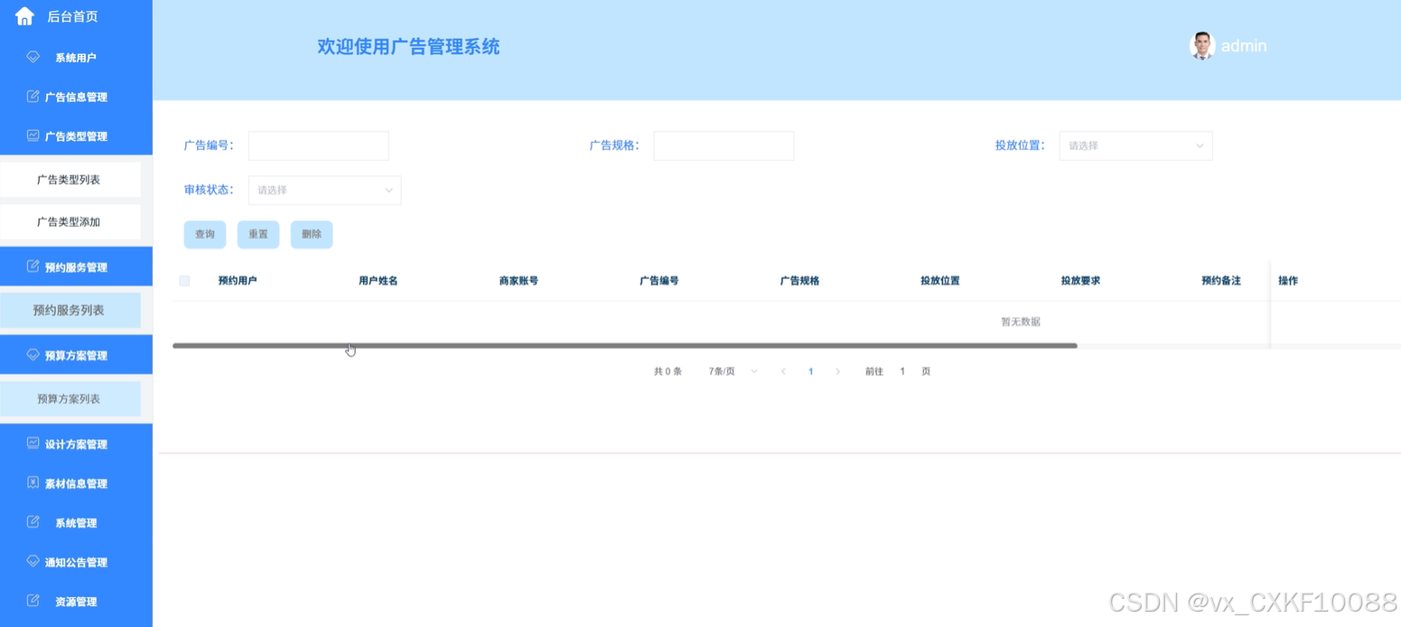 (5)预算方案管理:管理所有商家客户的预算方案信息,管理员可客户做出广告投放预算方案提供给用户参考。可进行查询、重置、删除等操作。