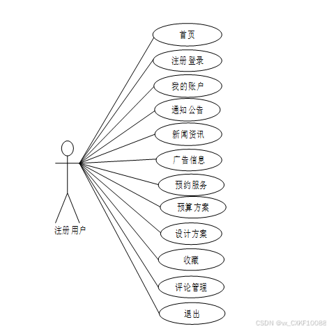 基于SpringBoot+Vue的广告管理系统中注册用户包含注册登录、首页、我的账户、通知公告、新闻资讯、广告信息、预约服务、设计方案、收藏、评论管理等功能模块,对应角色用例图如图3.1所示: