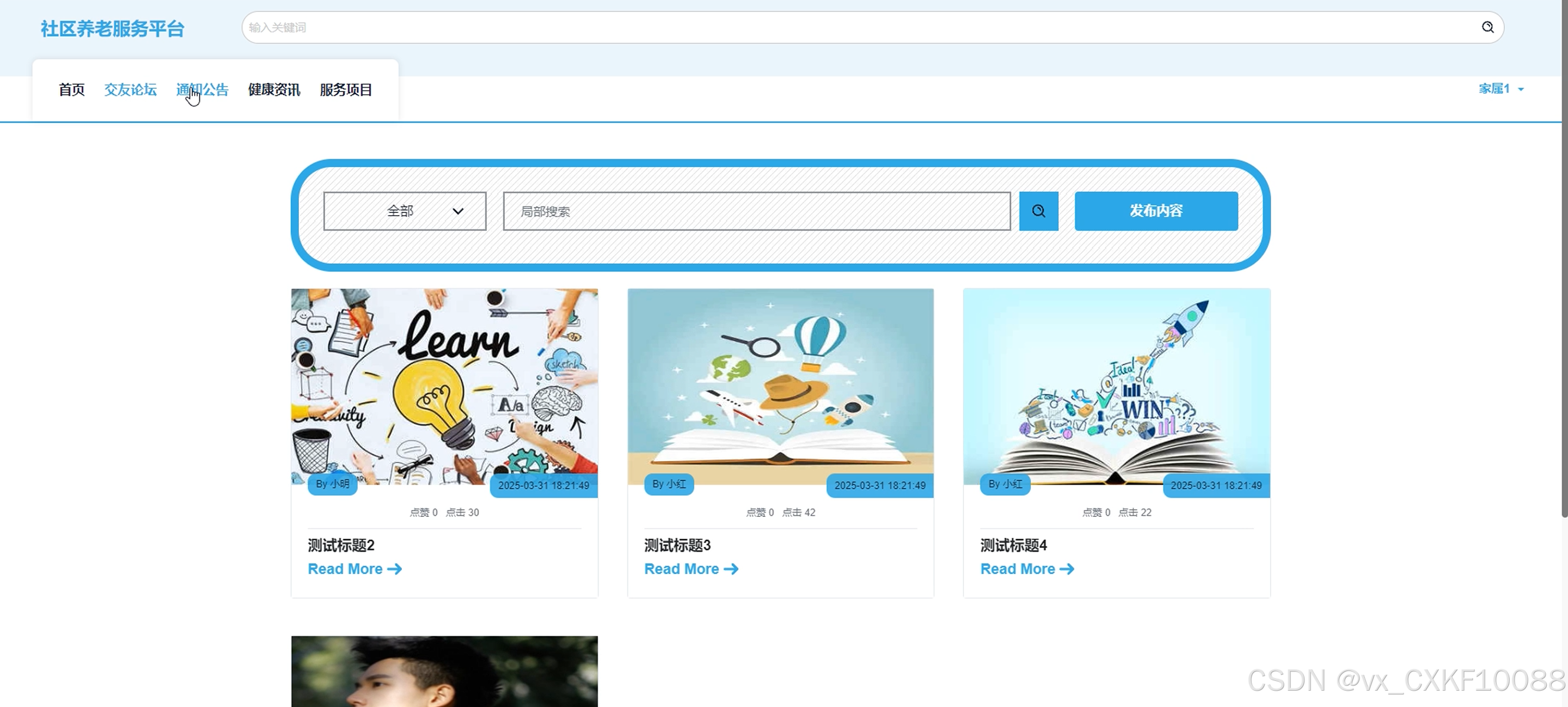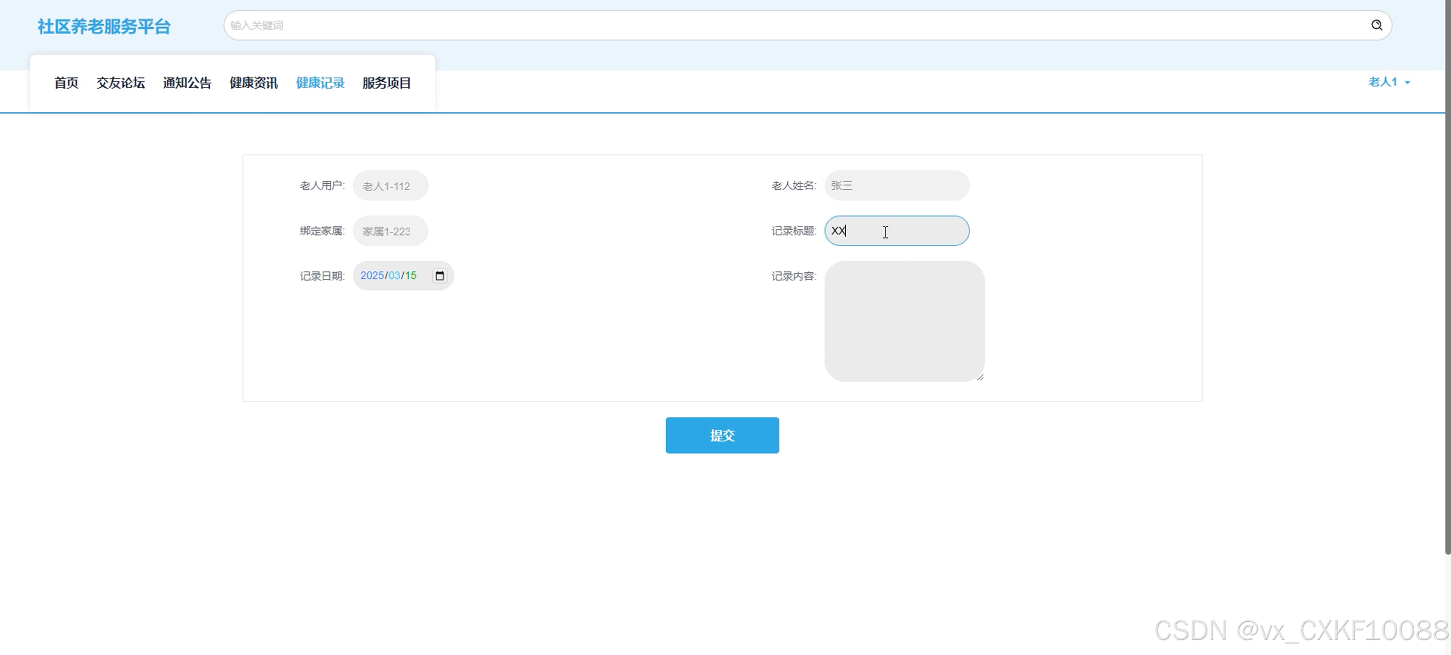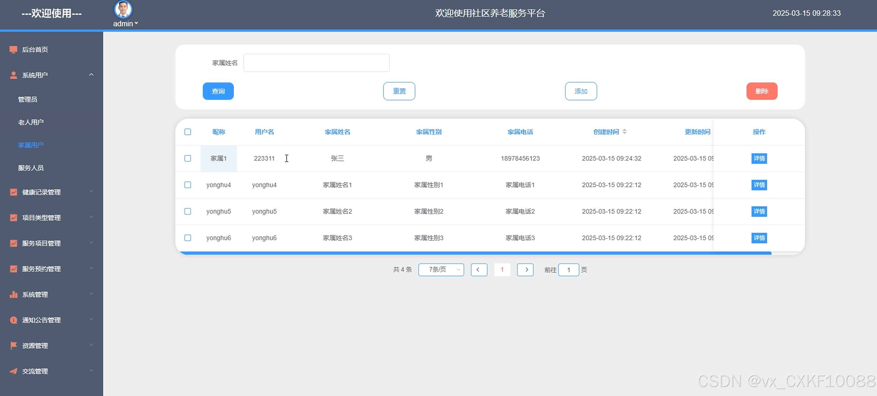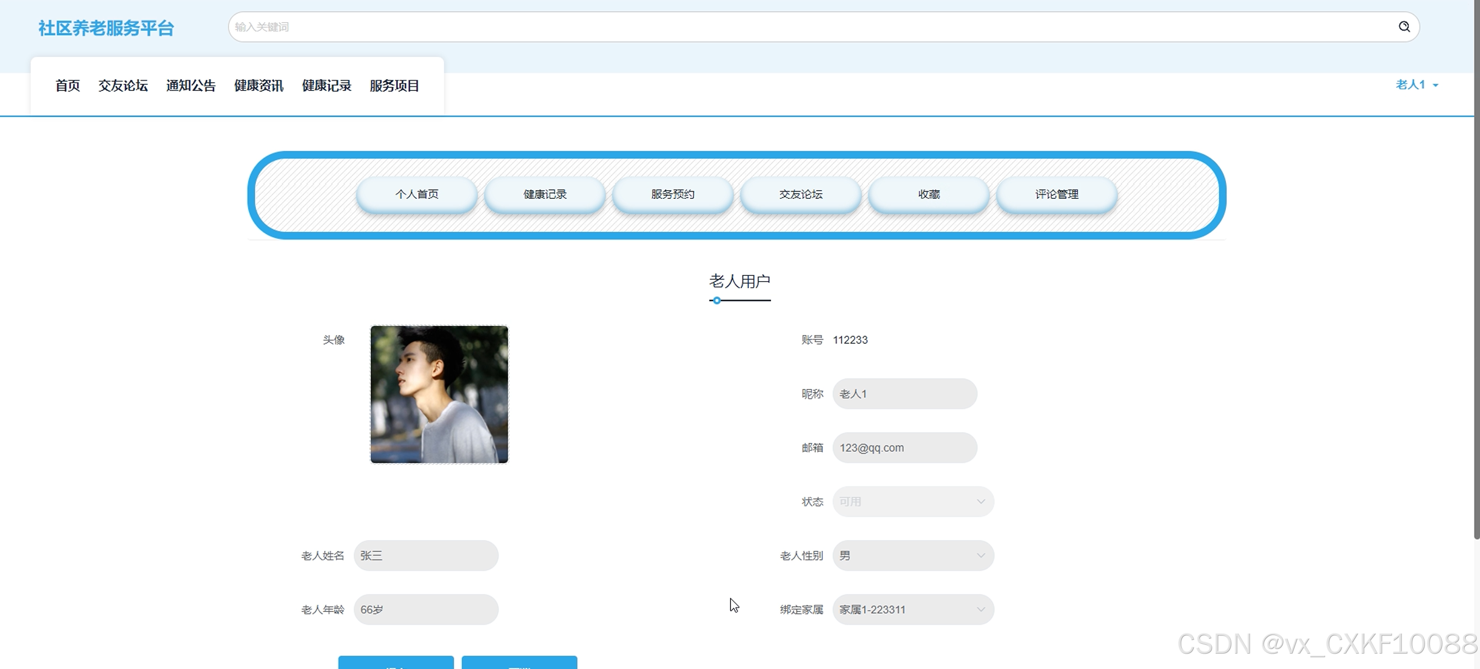 系统采用前后端分离架构,后端使用 Spring Boot 框架实现业务逻辑,前端使用 Vue 构建用户界面,数据库选用 MySQL 进行数据存储。系统功能涵盖老人用户、家属用户、服务人员和管理员等多角色模块。老人用户可通过平台浏览通知公告、健康资讯,查看健康记录,预约服务项目,并参与交友论坛;家属用户可查看老人的健康记录和服务预约情况,管理绑定的老人用户信息;服务人员可管理服务项目,处理服务预约,跟踪服务进度;管理员则负责用户管理、服务项目管理、资源管理及交流管理等操作。