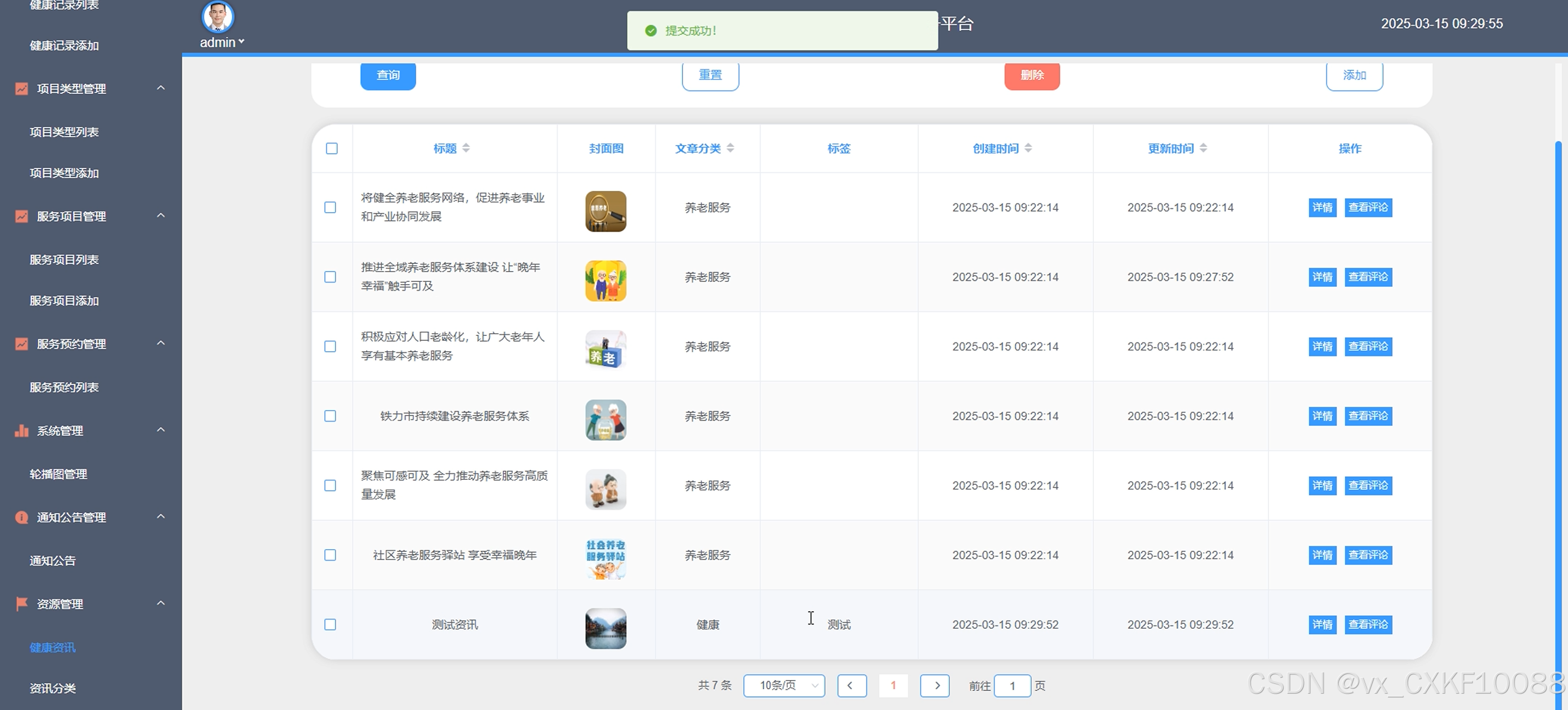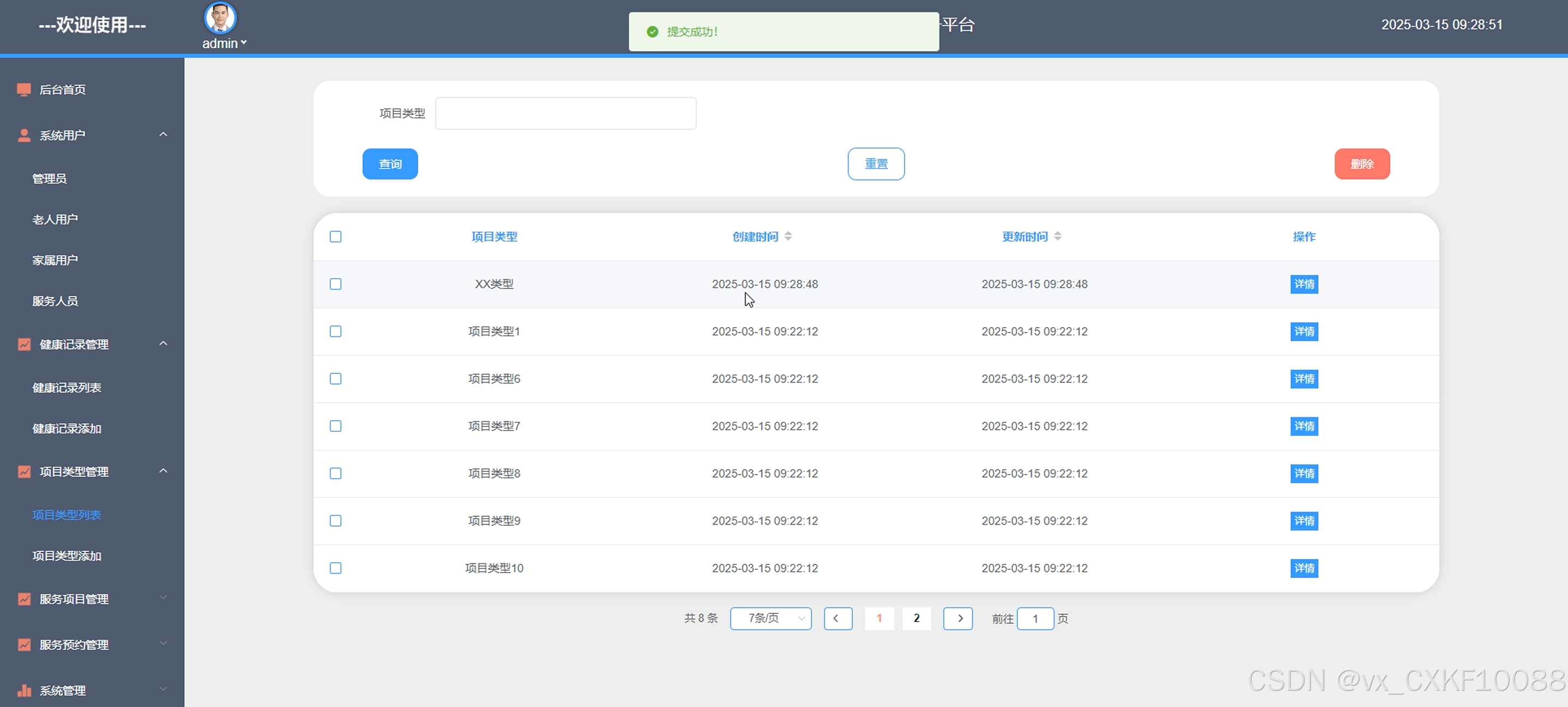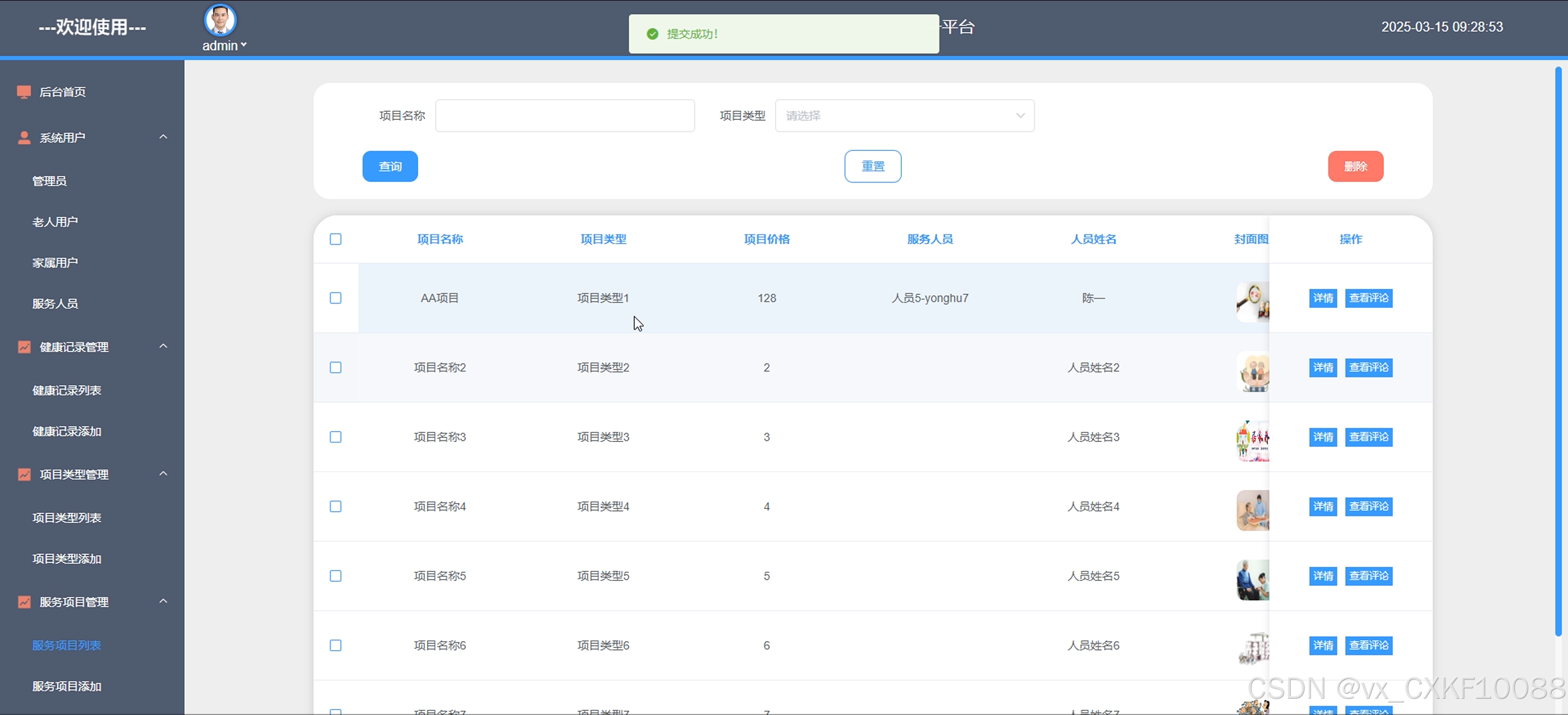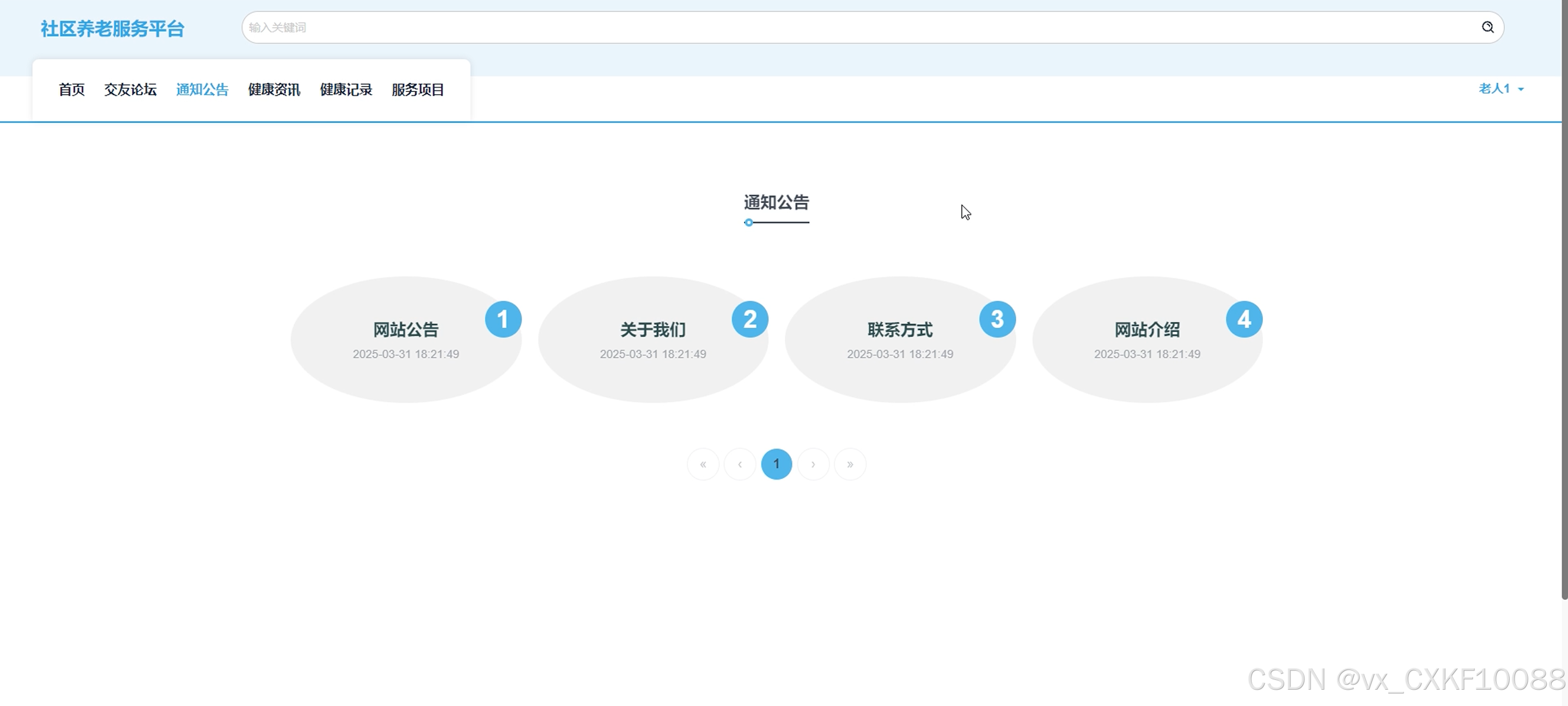 系统采用前后端分离架构,后端使用 Spring Boot 框架实现业务逻辑,前端使用 Vue 构建用户界面,数据库选用 MySQL 进行数据存储。系统功能涵盖老人用户、家属用户、服务人员和管理员等多角色模块。老人用户可通过平台浏览通知公告、健康资讯,查看健康记录,预约服务项目,并参与交友论坛;家属用户可查看老人的健康记录和服务预约情况,管理绑定的老人用户信息;服务人员可管理服务项目,处理服务预约,跟踪服务进度;管理员则负责用户管理、服务项目管理、资源管理及交流管理等操作。