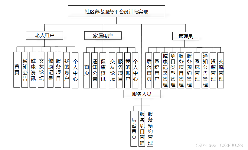 管理员:后台首页、系统用户(老人用户、家属用户、服务人员、管理员)、健康记录管理、项目类型管理、服务项目管理、服务预约管理、系统管理(轮播图)、通知公告管理、资源管理(健康资讯、资讯分类)、交流管理(交流论坛、论坛分类)等功能。