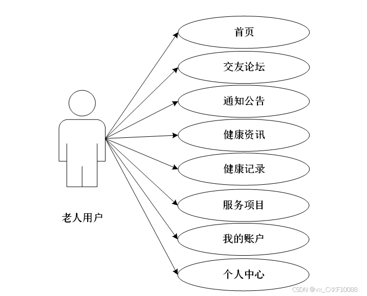 老人用户:首页、交友论坛、通知公告、健康资讯、健康记录、服务项目、我的(个人首页、健康记录、服务预约、交友论坛、收藏、评论管理)等功能。