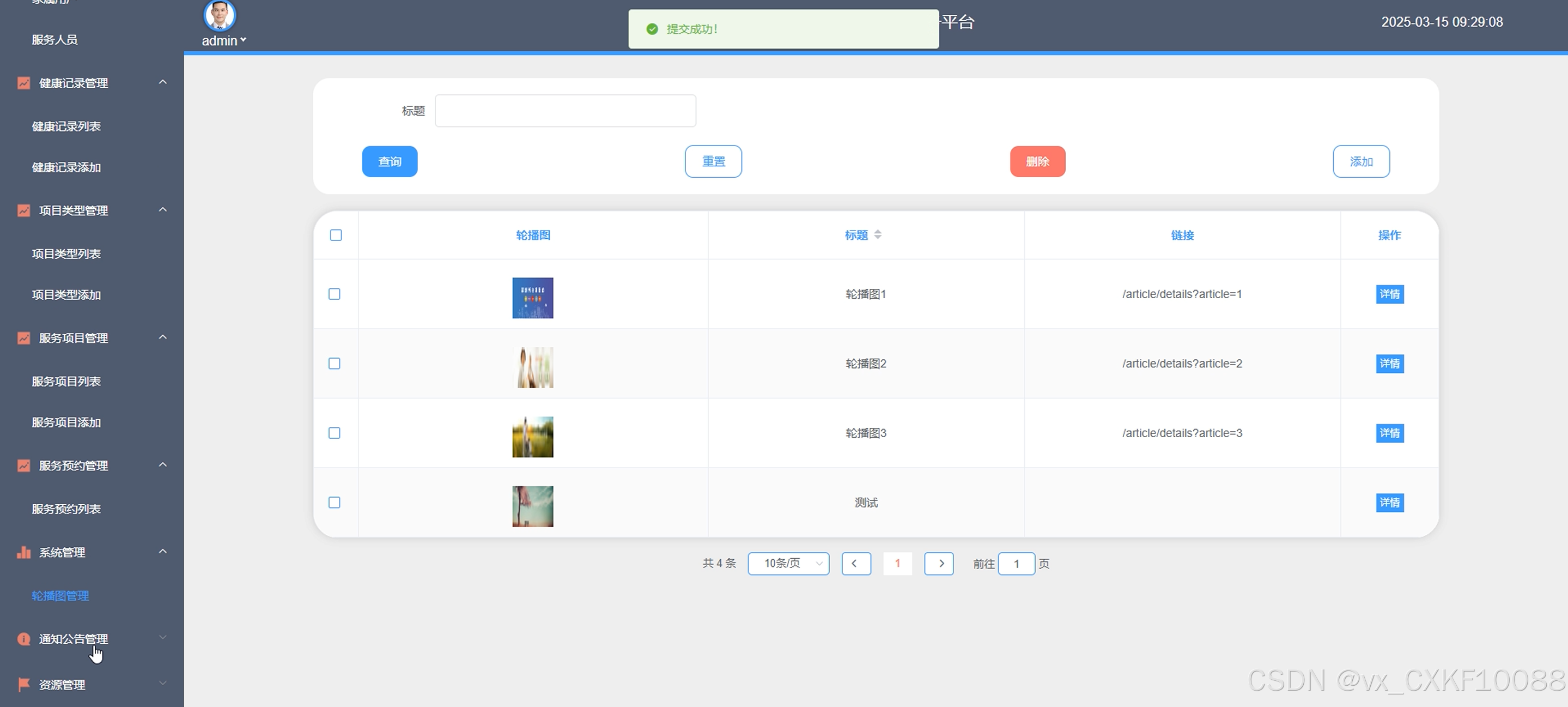 | 点击添加轮播图,必填项合法输入,点击保存 | 提示添加成功 | 与预期结果一致 | 点击添加轮播图,必填项合法输入,点击保存 |