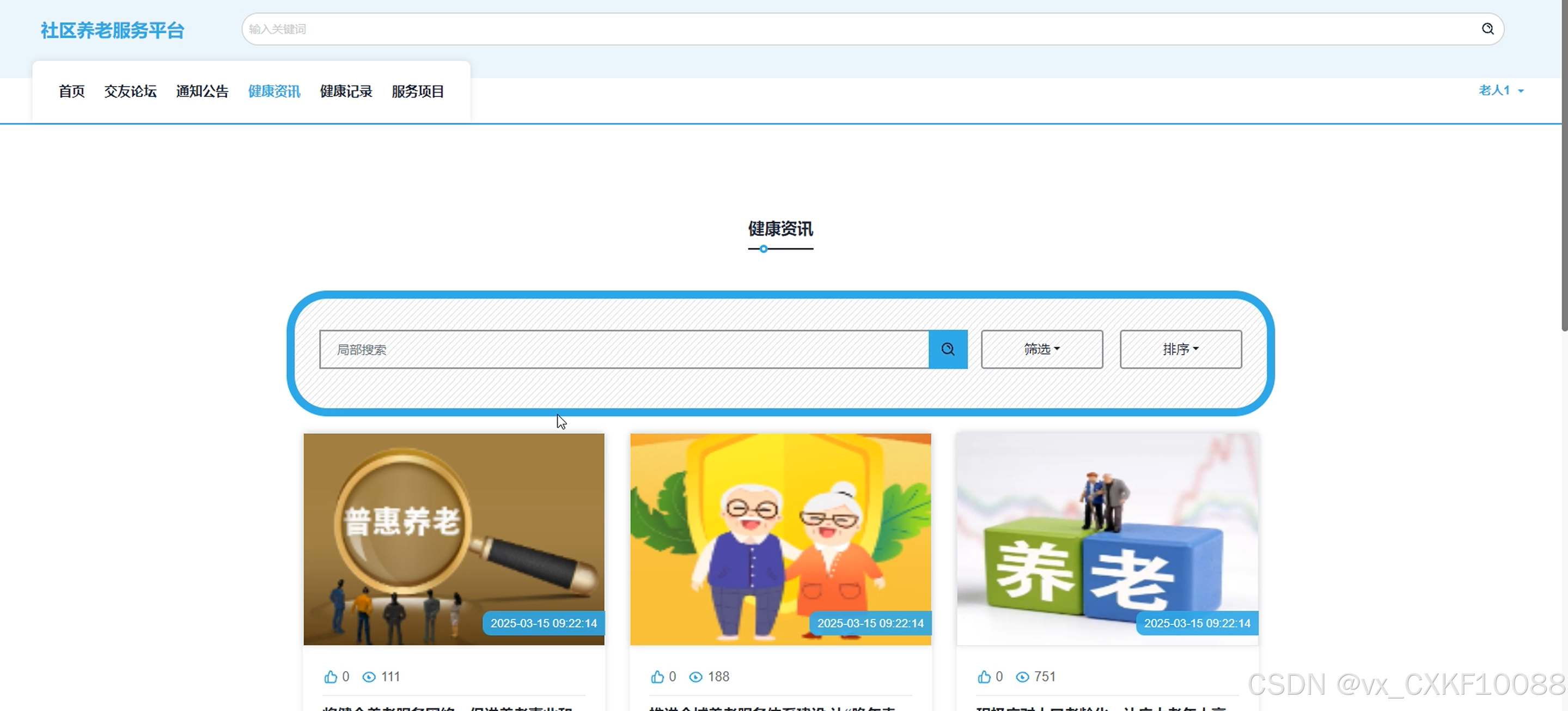 未来,可进一步引入更多个性化推荐功能,以增强系统的用户体验和内容精准度。随着技术的不断发展,平台还可以探索更多智能化服务,如智能健康提醒、远程健康咨询等,以进一步提升服务质量和效率。本文的研究为社区养老服务平台的数字化转型提供了有益的参考,具有一定的理论价值和实践意义。