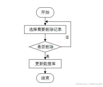 用户选择需要删除的记录后,系统判断是否确认删除。若未确认,返回选择环节;若确认删除,则更新数据库,删除对应记录,完成操作后流程结束。删除信息流程图如图4-5所示。